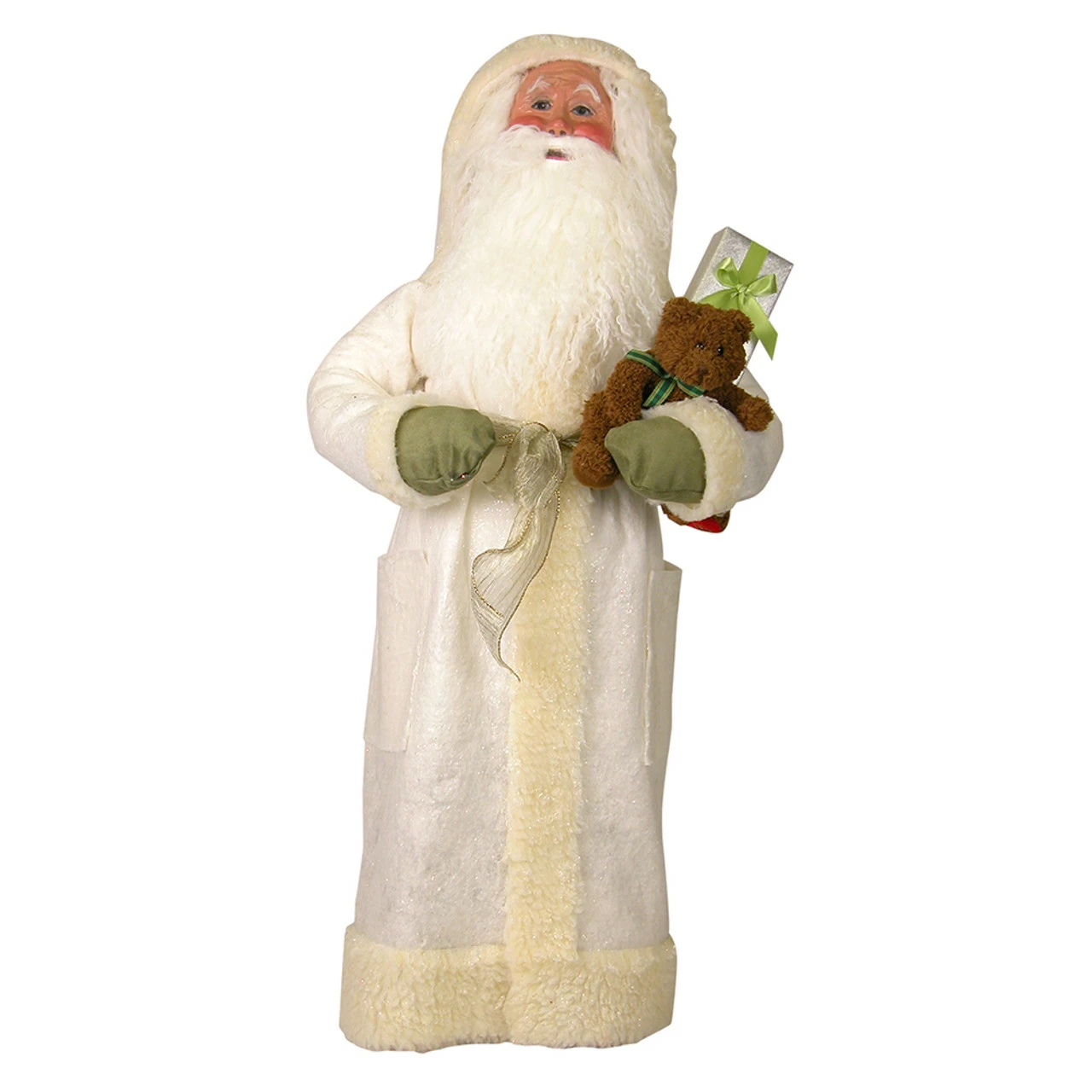 Features Santa in an iridescent glittered robe trimmed in white faux fur