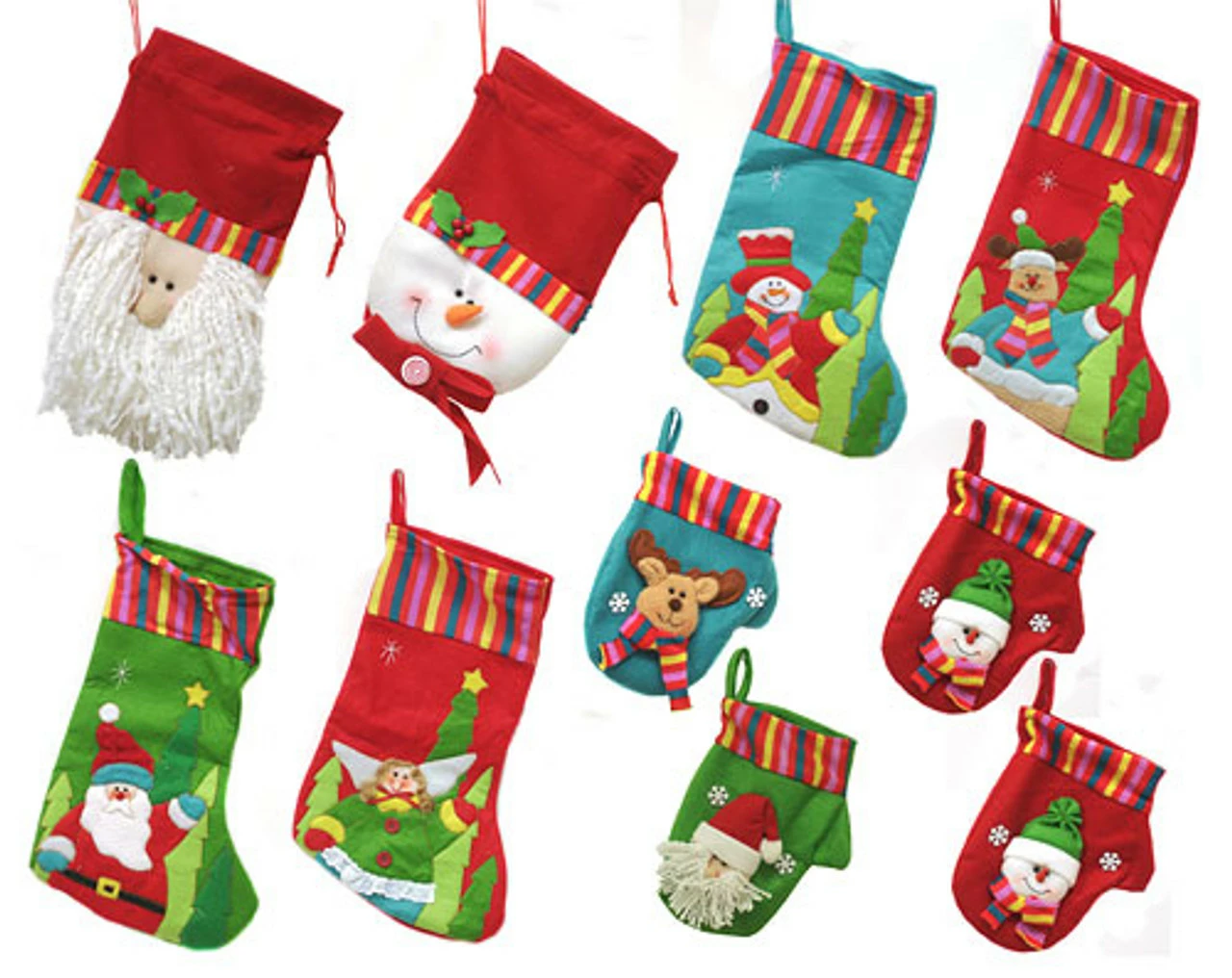 Assorted 10 piece set includes: 4 Christmas stockings, 4 mittens and 2 gift bags