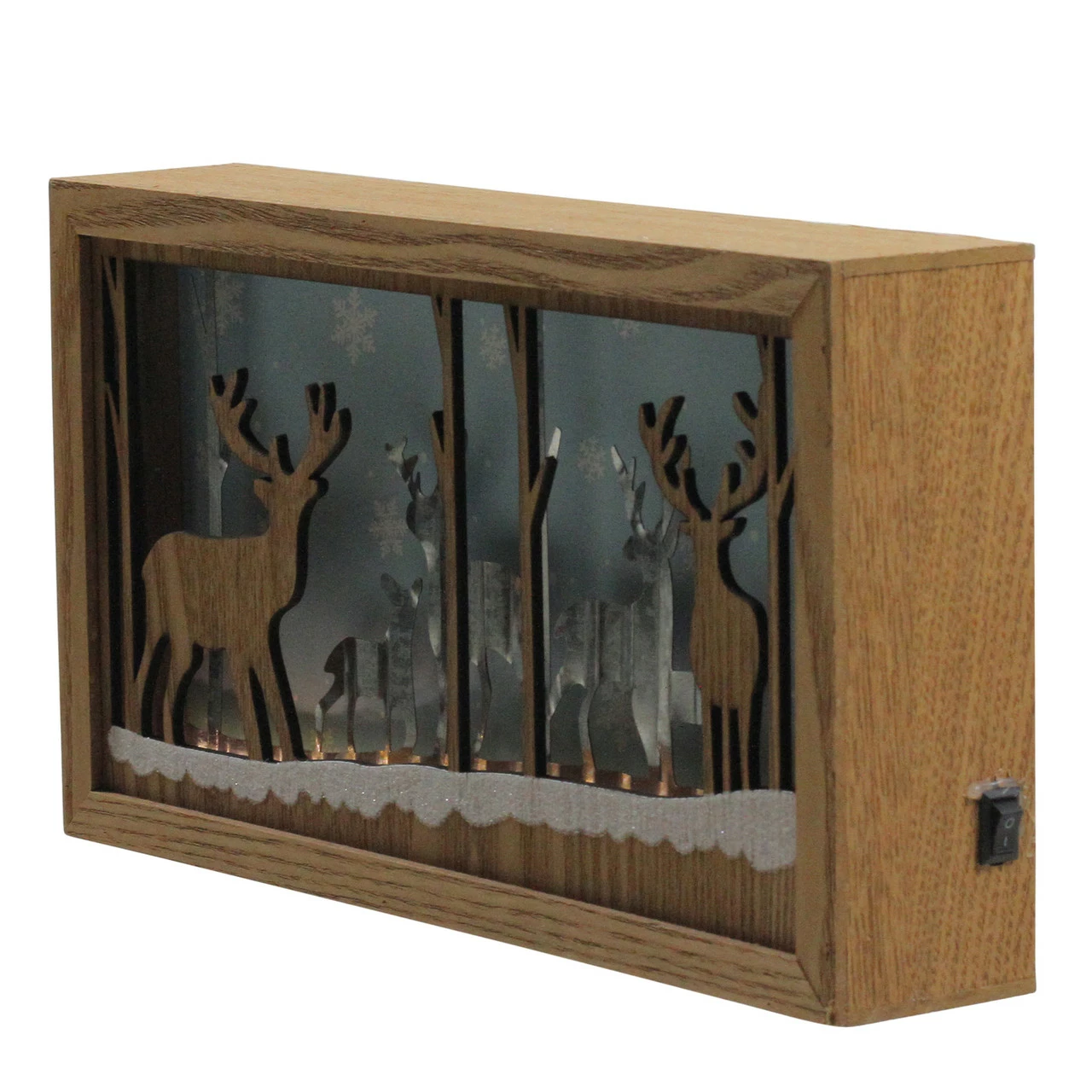 Features a wooden rectangular shadow box with layered designs inside