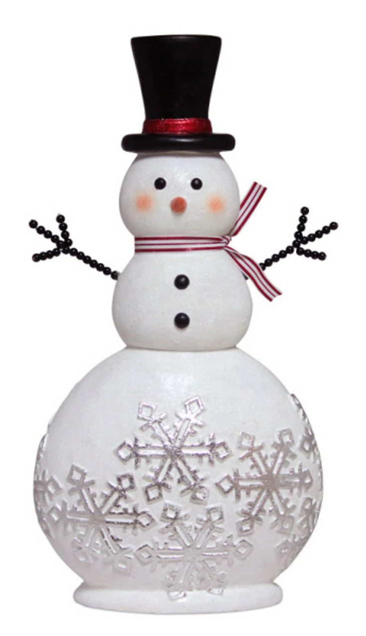 Features a snowman wearing a red and white scarf