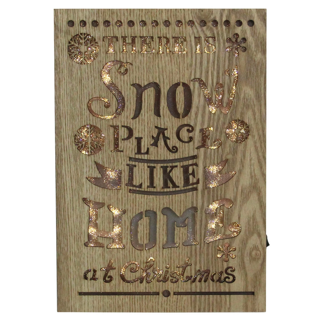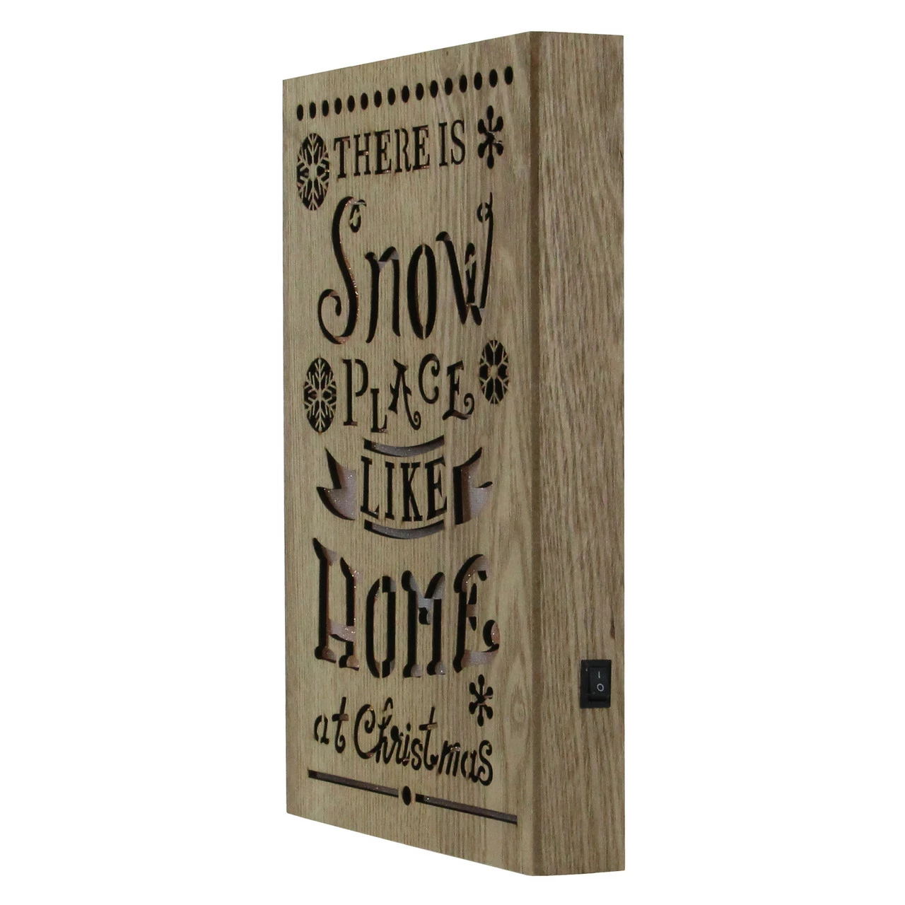 Features a wooden plaque with the words “There is Snow Place Like Home at Christmas” cut out