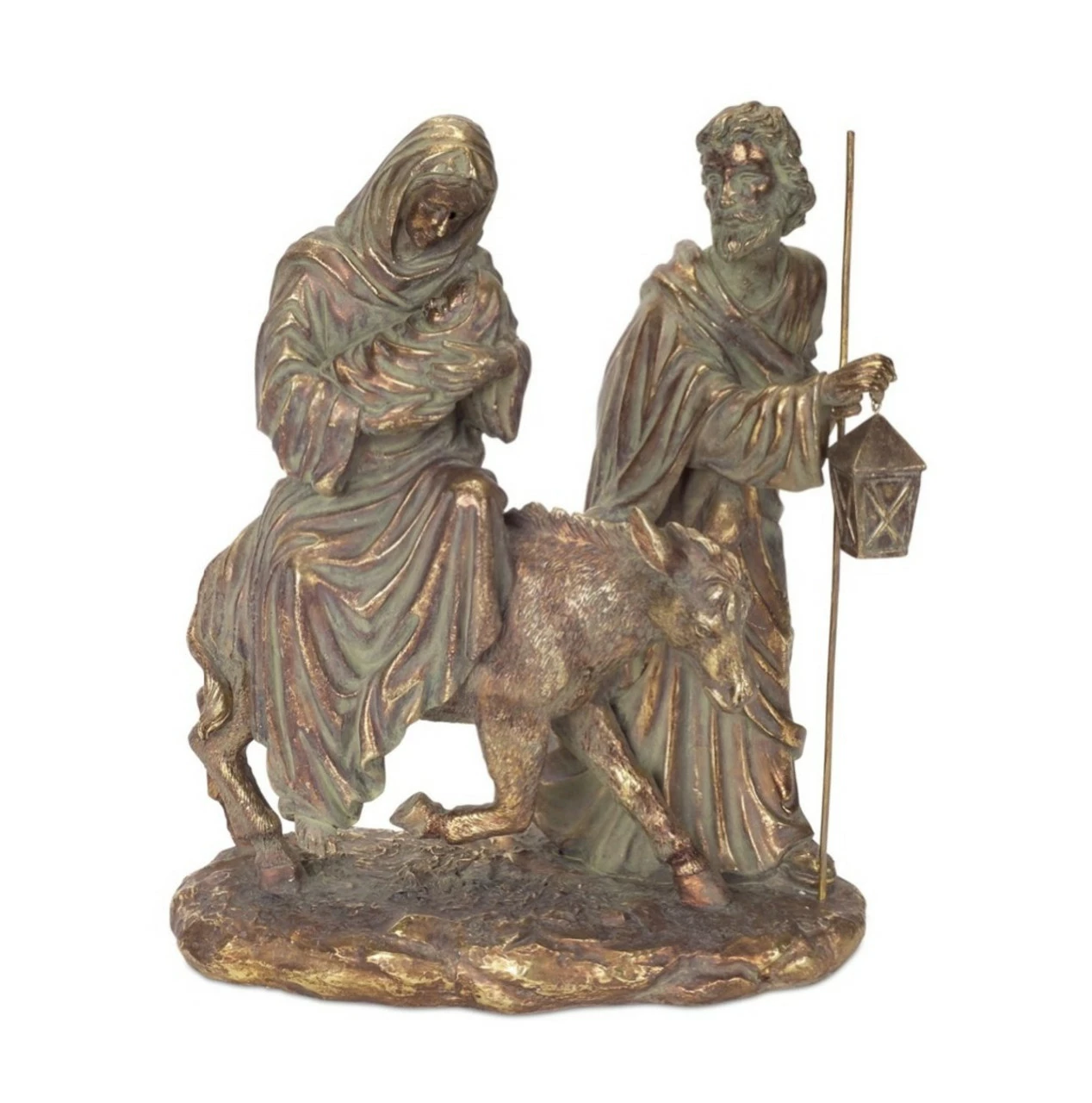 Joseph walking alongside the donkey that Mary and the Baby Jesus are sitting upon