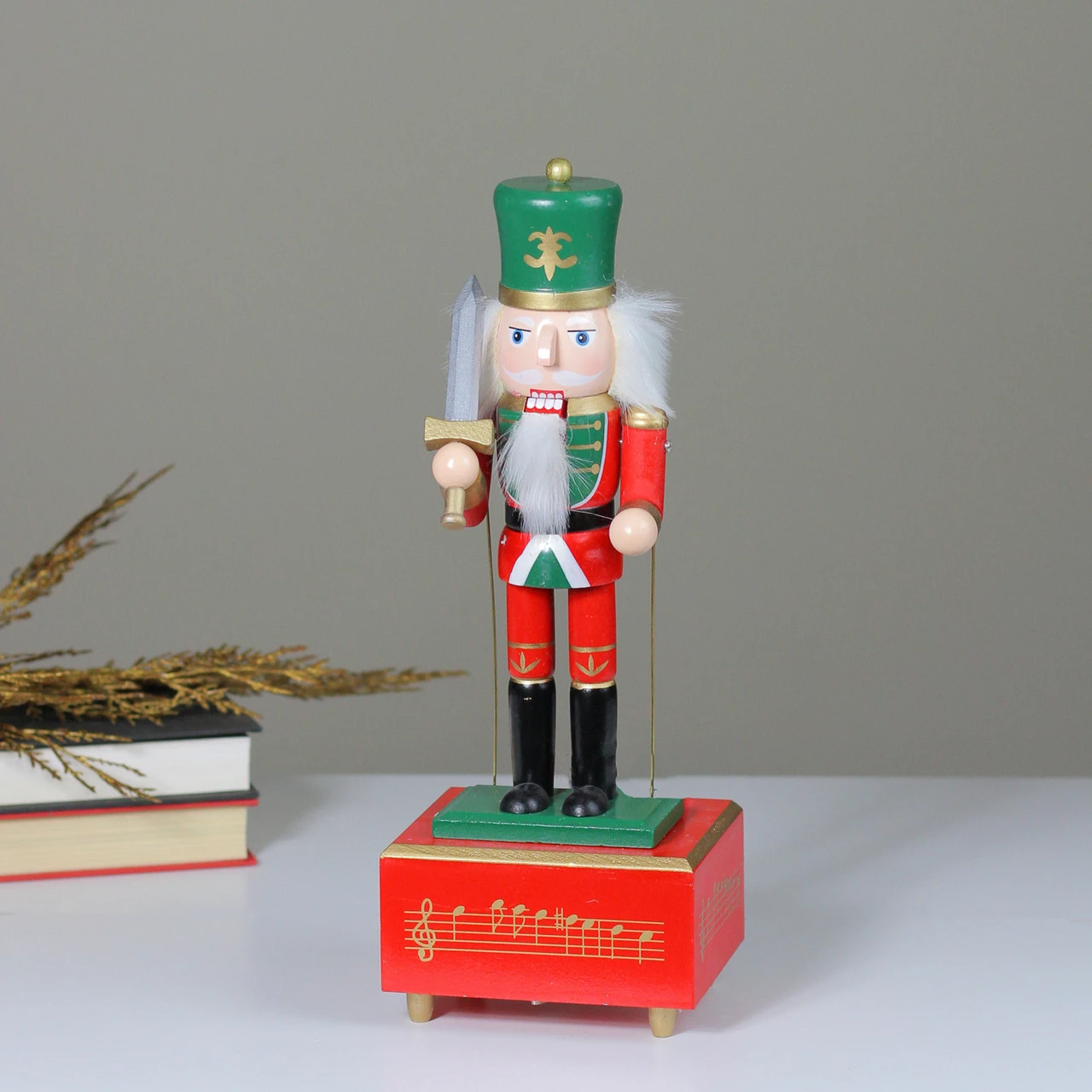 Features a nutcracker guard is holding gold and silver sword