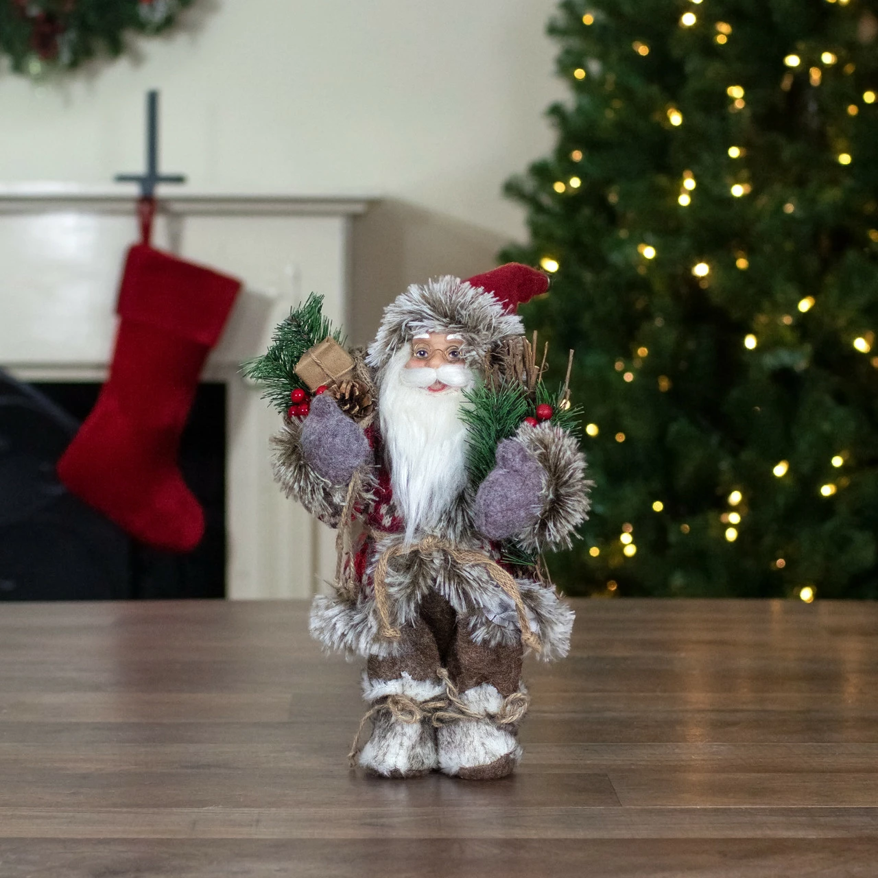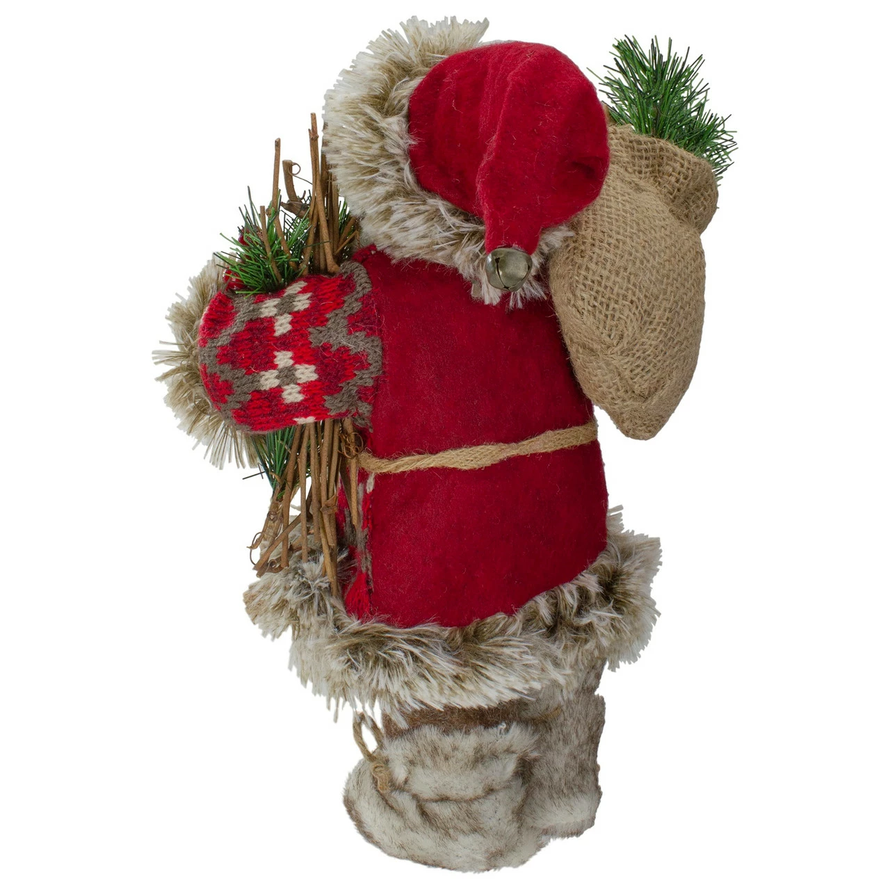 Holding a burlap bag full of artificial pine, pine cone, berries, and 1 present