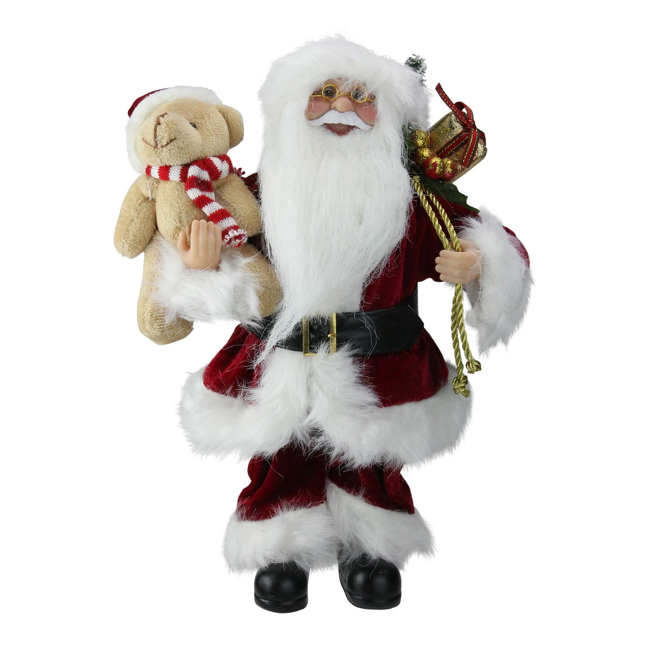 In the opposite hand Santa is holding onto a festive teddy bear wearing a scarf and hat