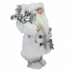 Dressed in a faux fur suit, hat, and boots accented with silver rope and buttons