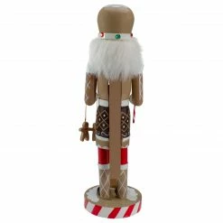 Holds two dangling gingerbread cookies in one hand and a candy cane in the other