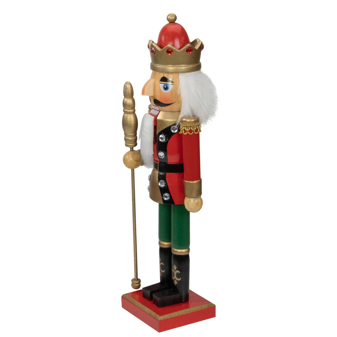 Holding gold scepter in hand with gold crown accented with red jewels