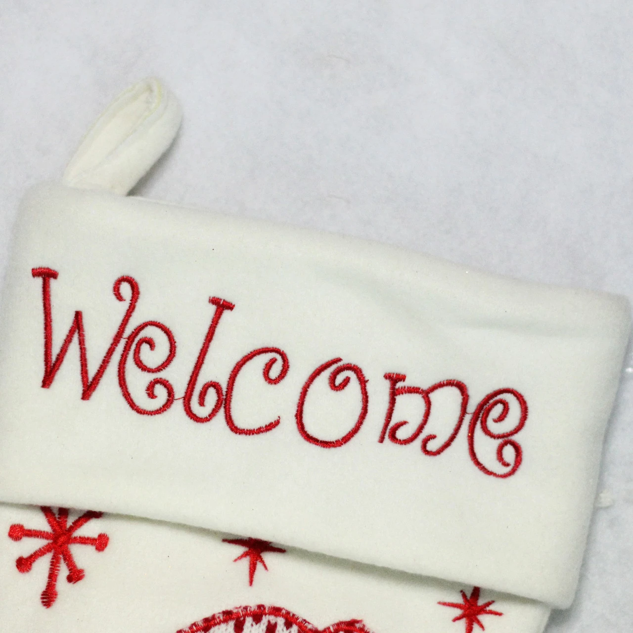 The word “Welcome” is embroidered in red on the cuff