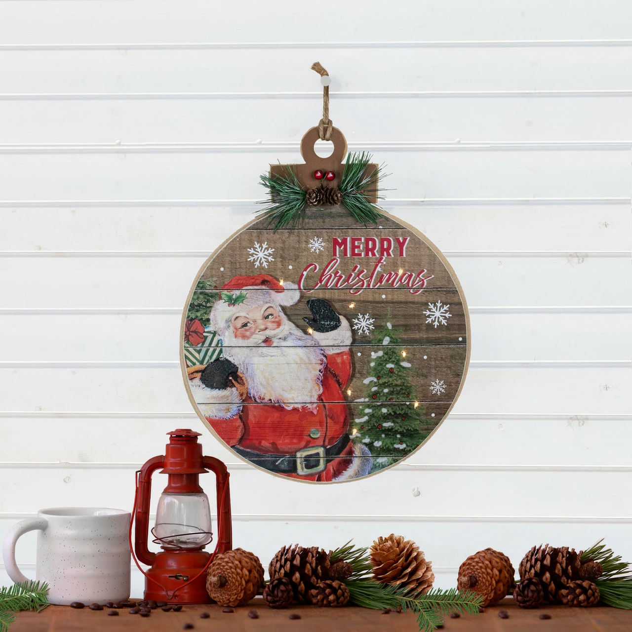 Features Santa Claus holding his gift bag, a forest tree, and snowflakes