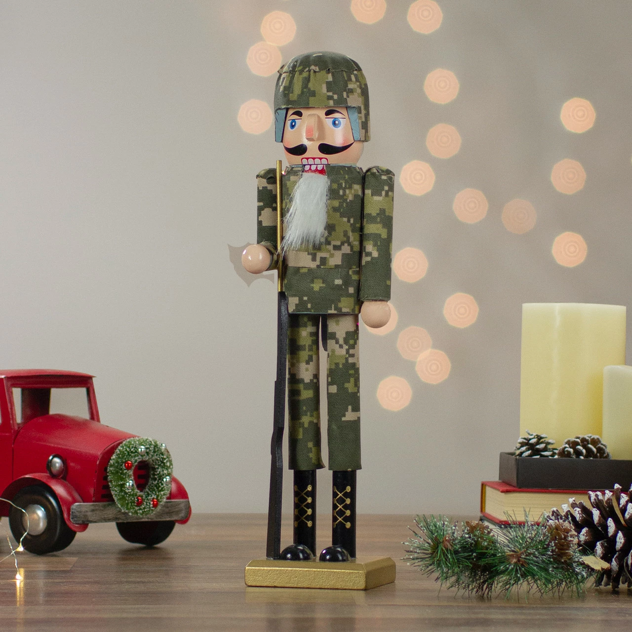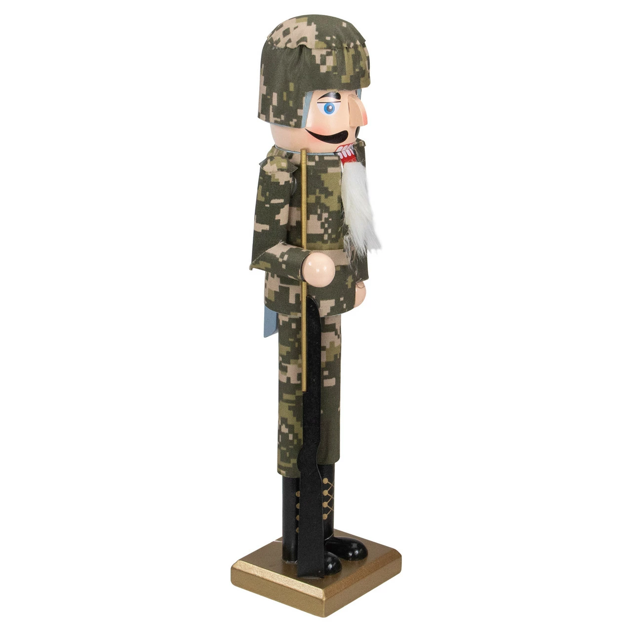 Nutcracker soldier is wearing a green army fatigue uniform