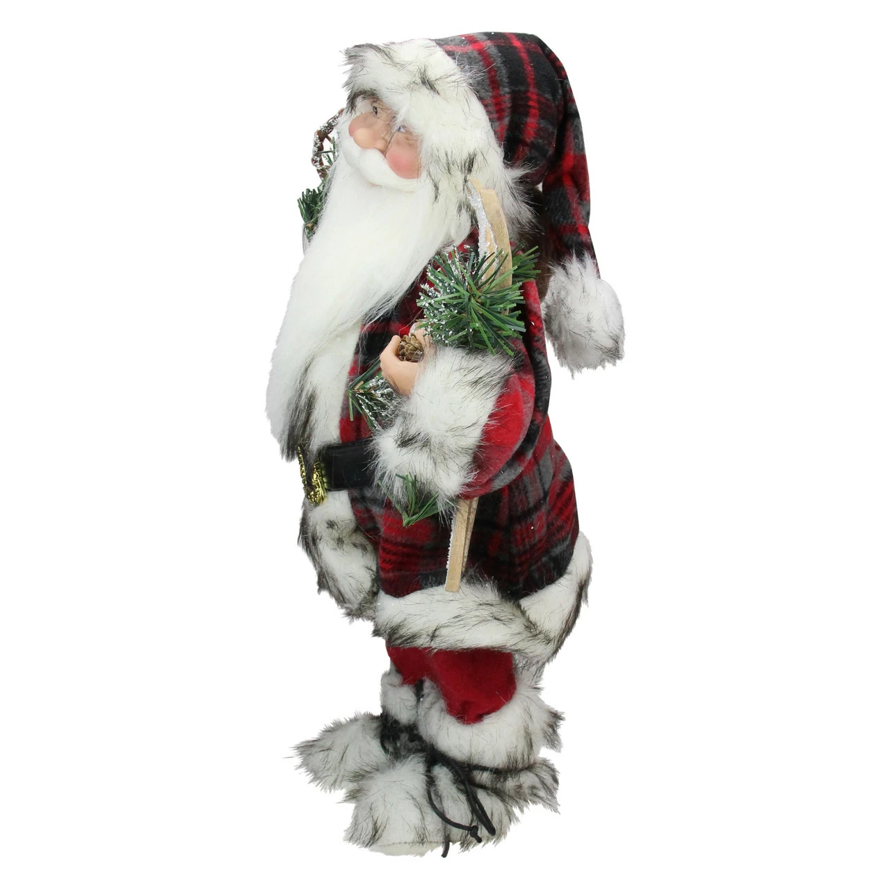 This Santa is wearing a plaid jacket and hat with red pants accented with faux fur