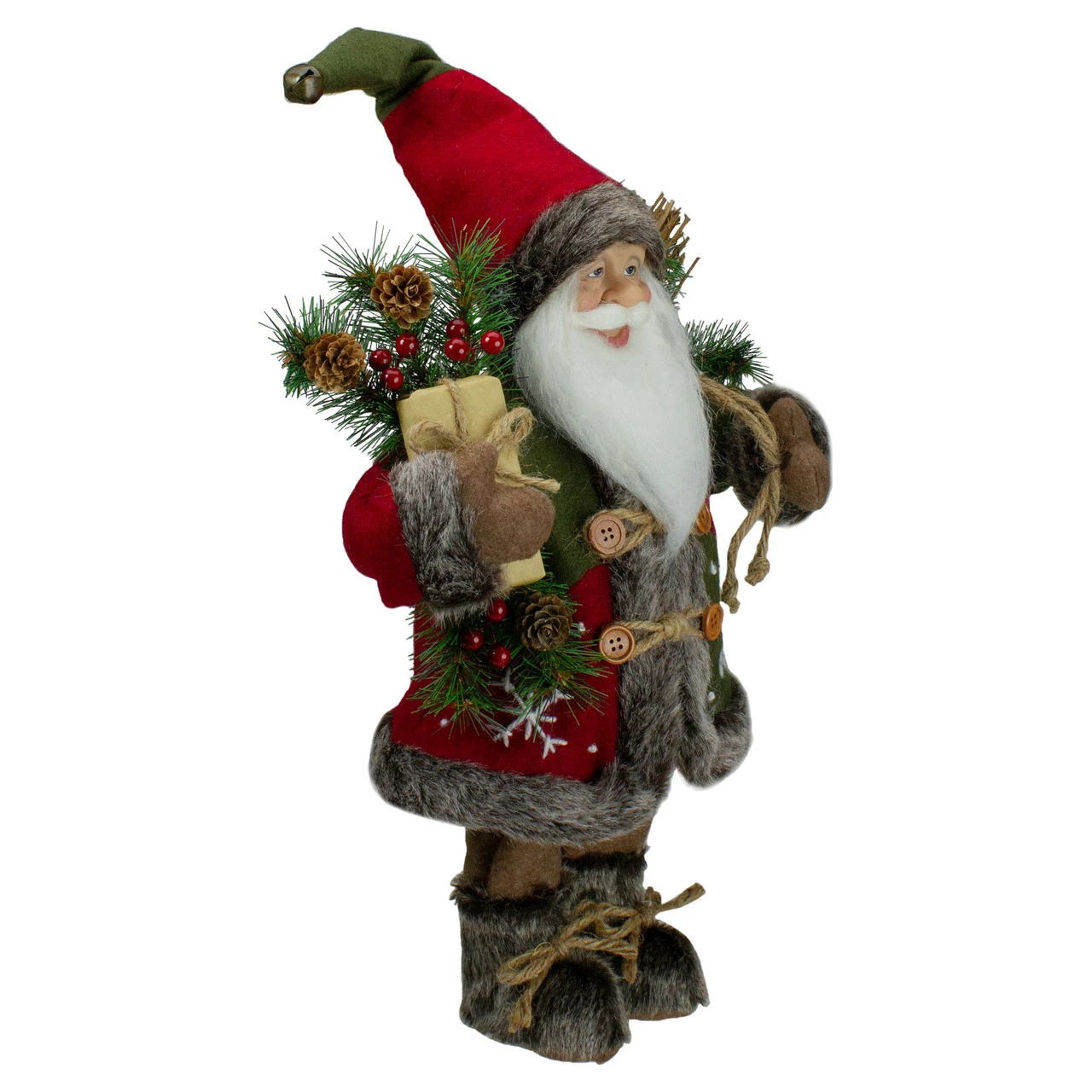 Present and sack are accented with pine needles, pinecones, twigs, and berries