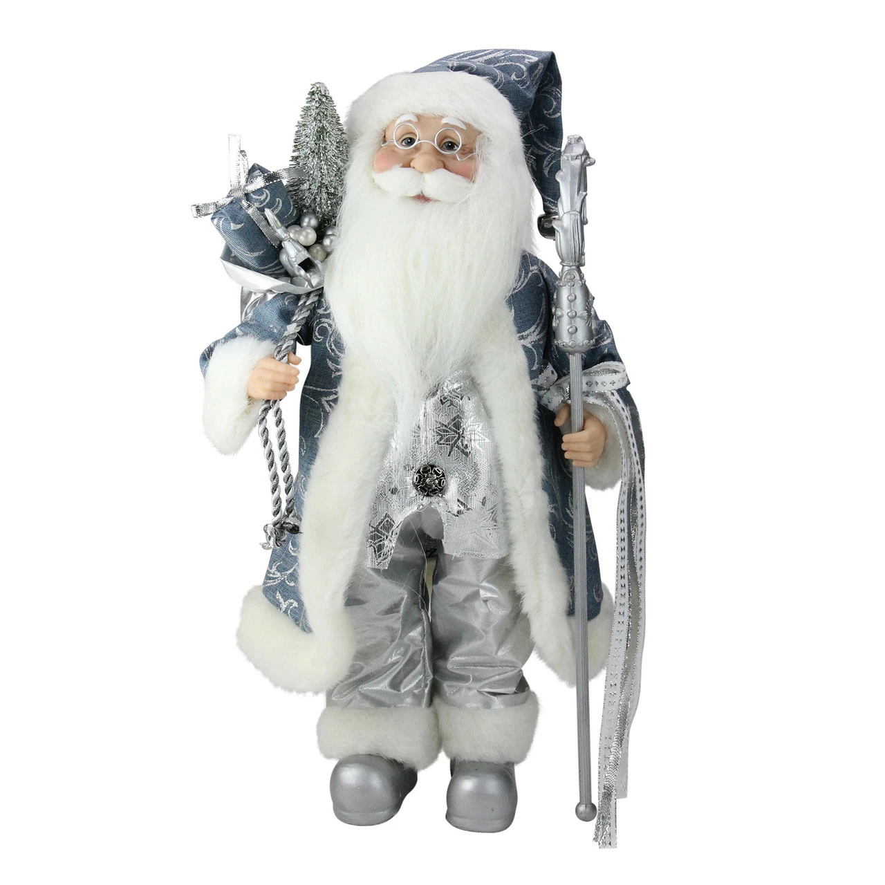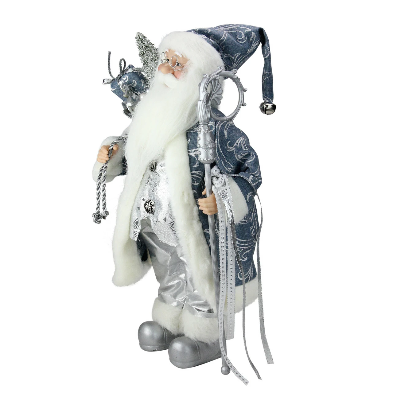 Features Santa in a blue and silver suit accented with faux fur and snowflakes
