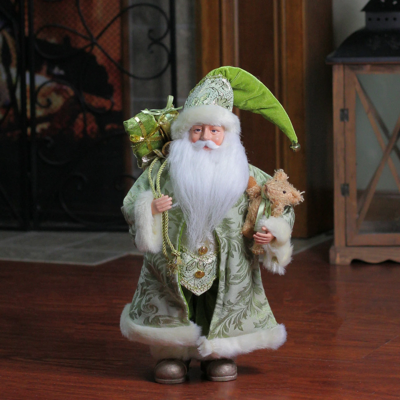 Features Santa wearing a green coat with a jacquard pattern and a faux fur trim