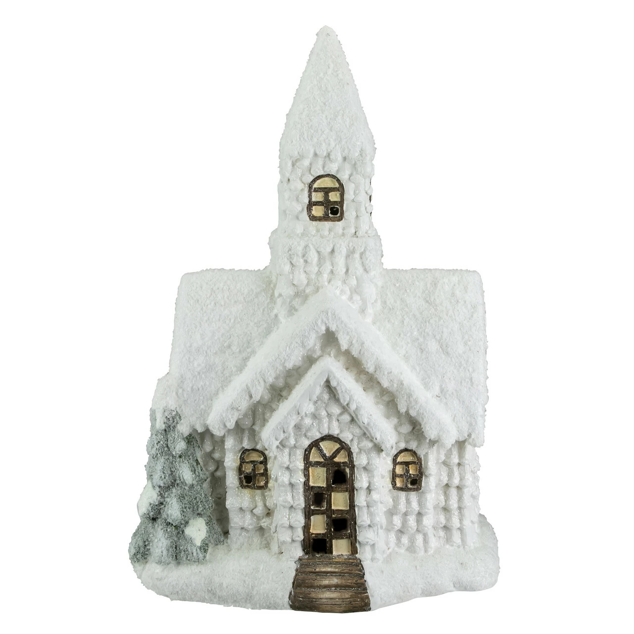 Church is designed with a steeple and a pine tree on the side