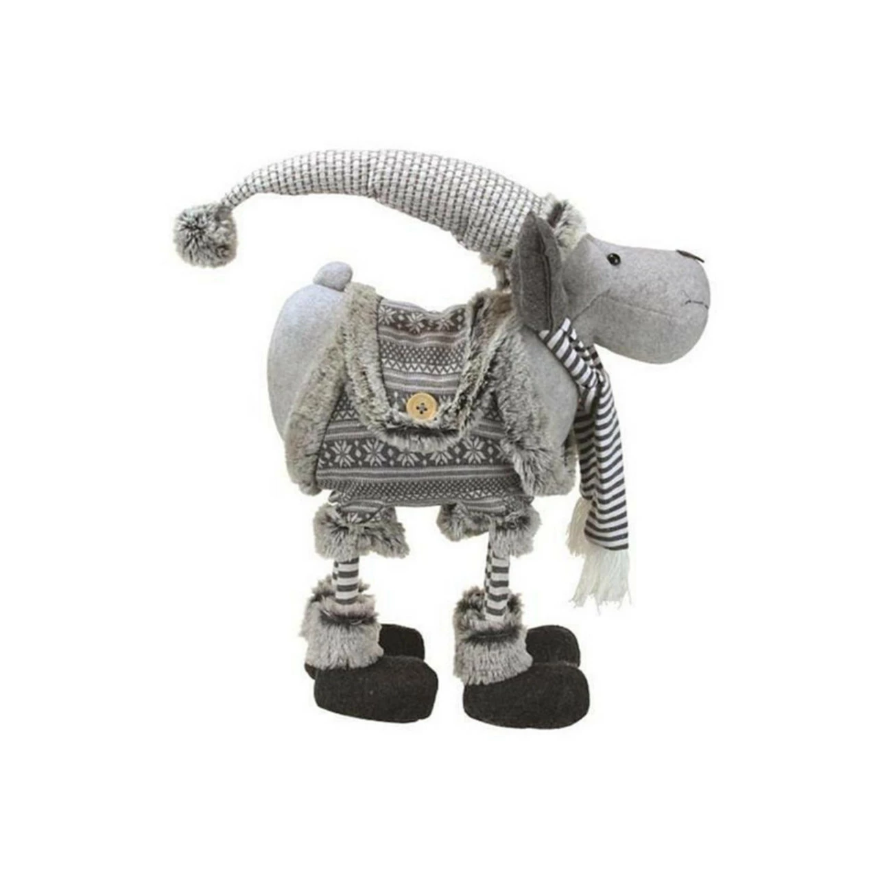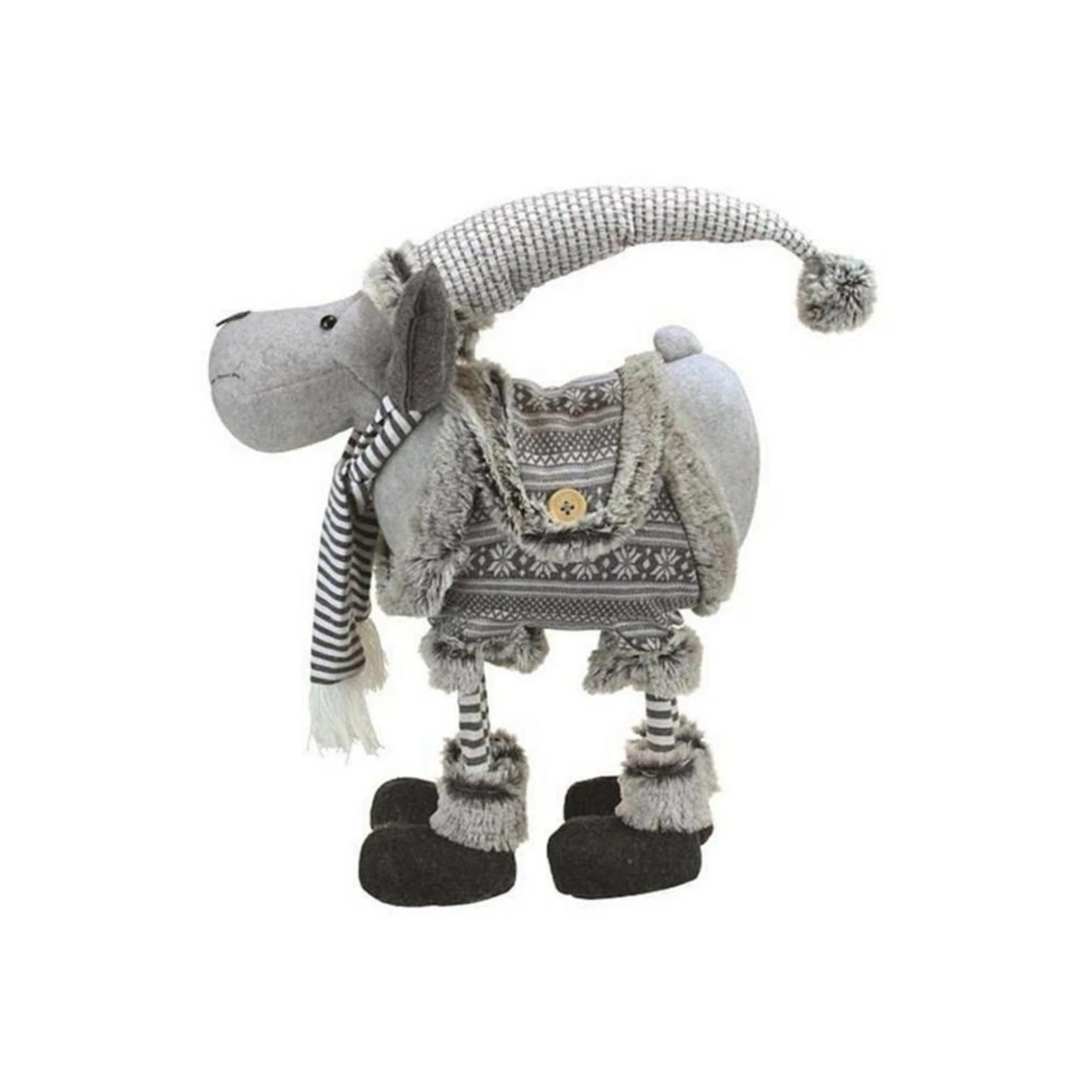 Moose is wearing a gray Nordic sweater and gray boots with faux fur trim