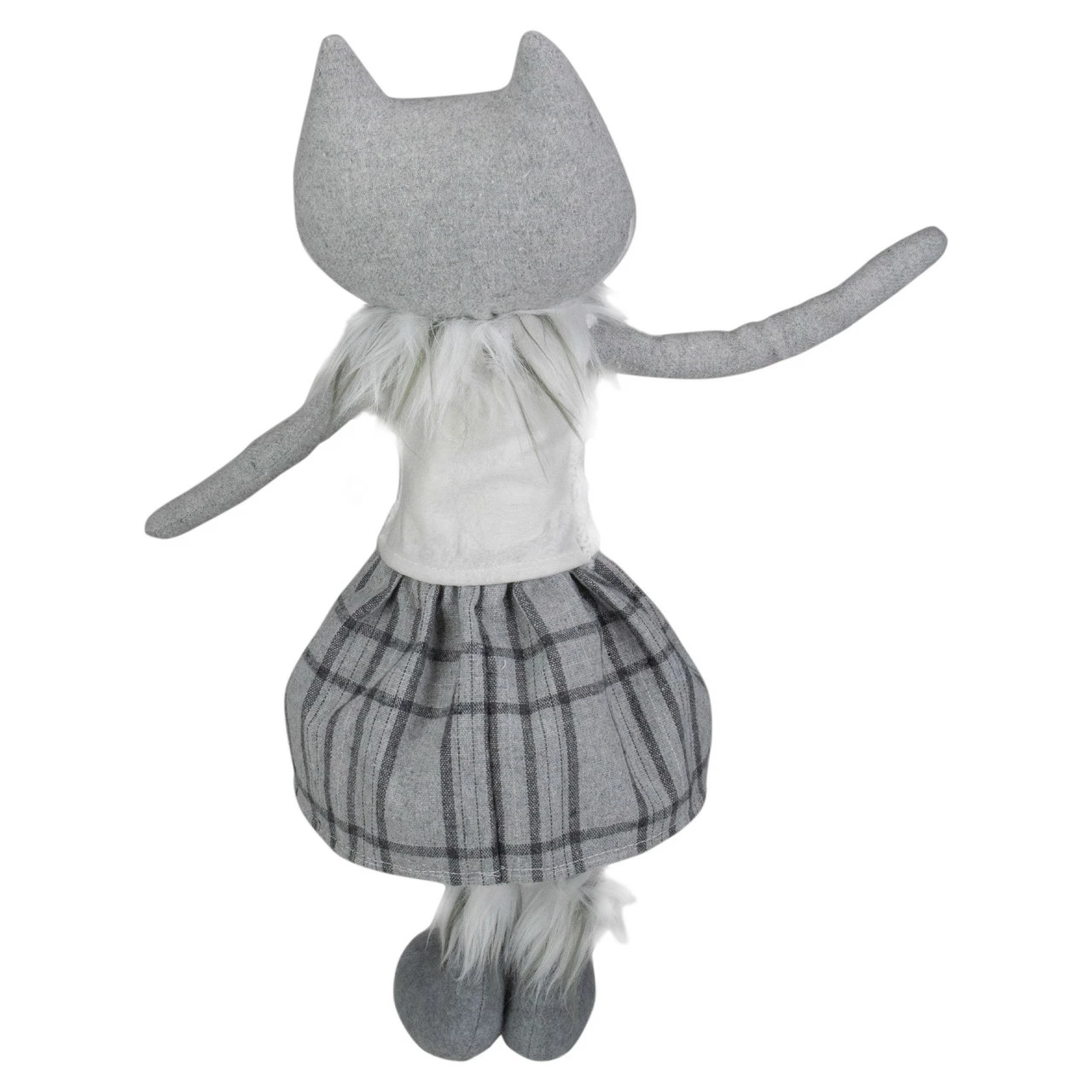 Gray and white tufted faux fur around her head
