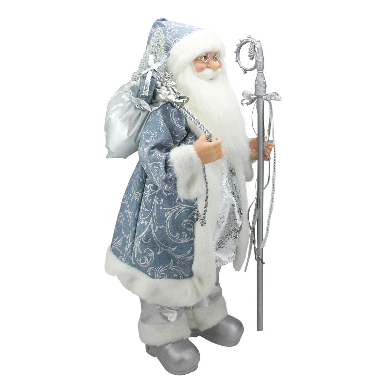 Features Santa in a blue and silver suit accented with faux fur and snowflakes