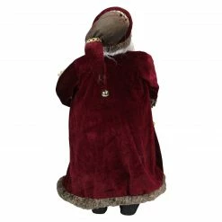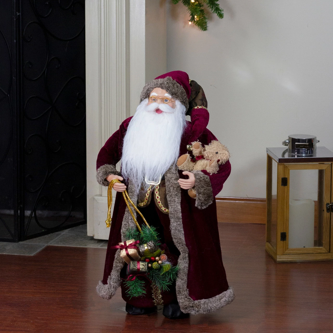 Santa is wearing a long burgundy red robe with faux fur and a brown vest with gold accents