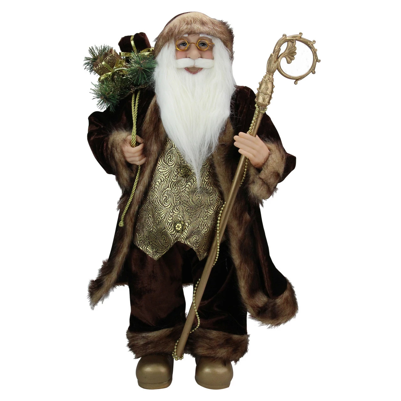Equipped with a bronze sack full of gifts, gold horn, pine sprigs and majestic golden staff