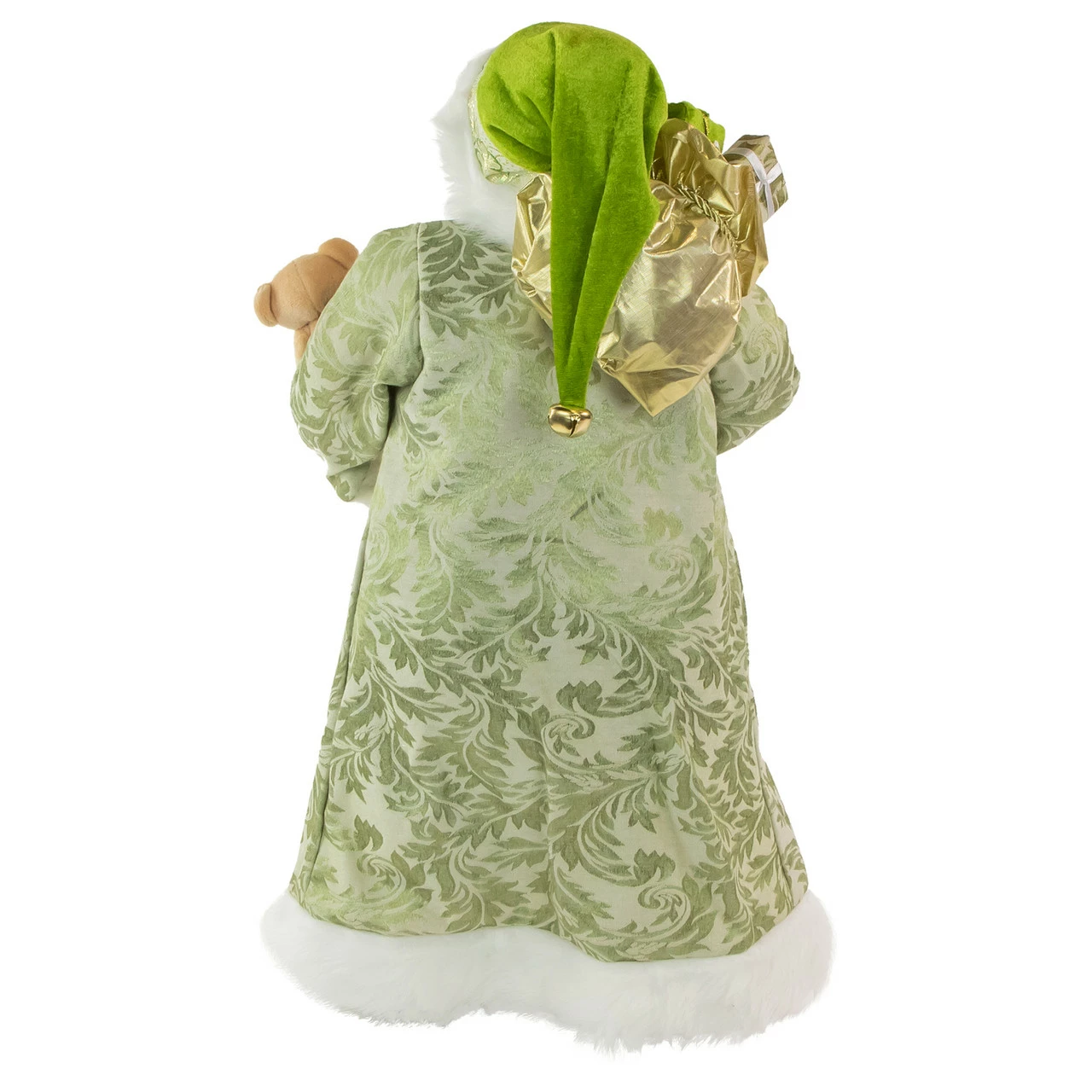 Features Santa wearing a green coat with a jacquard pattern and a faux fur trim