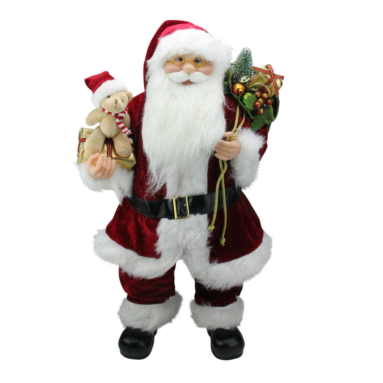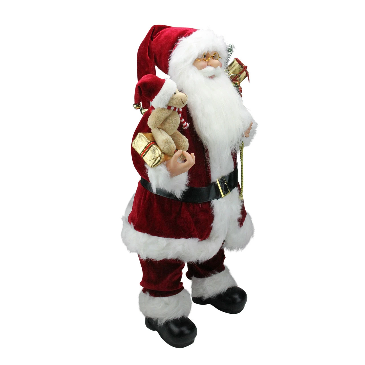 This traditional Santa Claus is wearing his standard red and white suit and has a teddy bear and wrapped present in his one hand and a sack of gifts over his opposite shoulder.