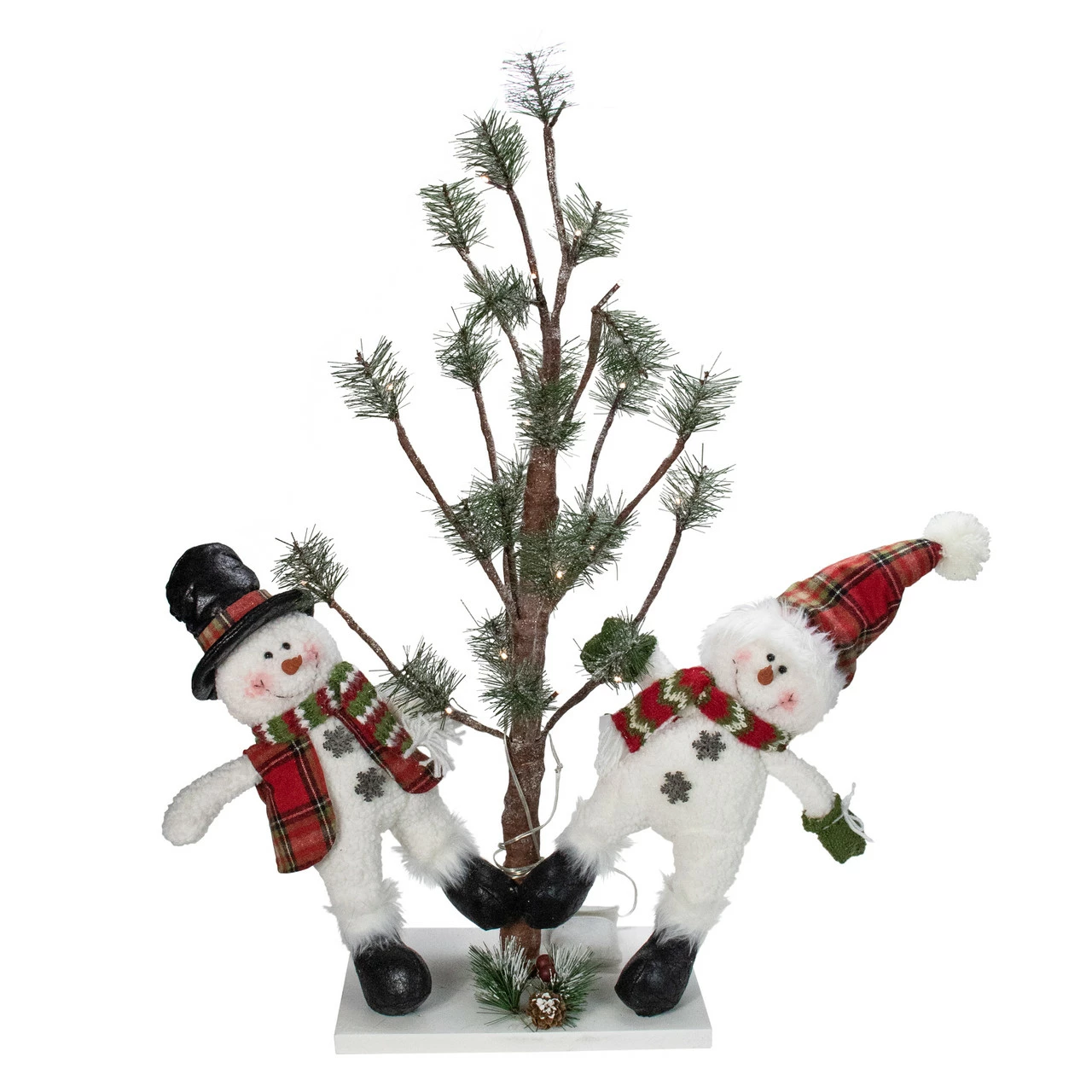 Features 2 plush snowmen hanging on a frosted pine tree