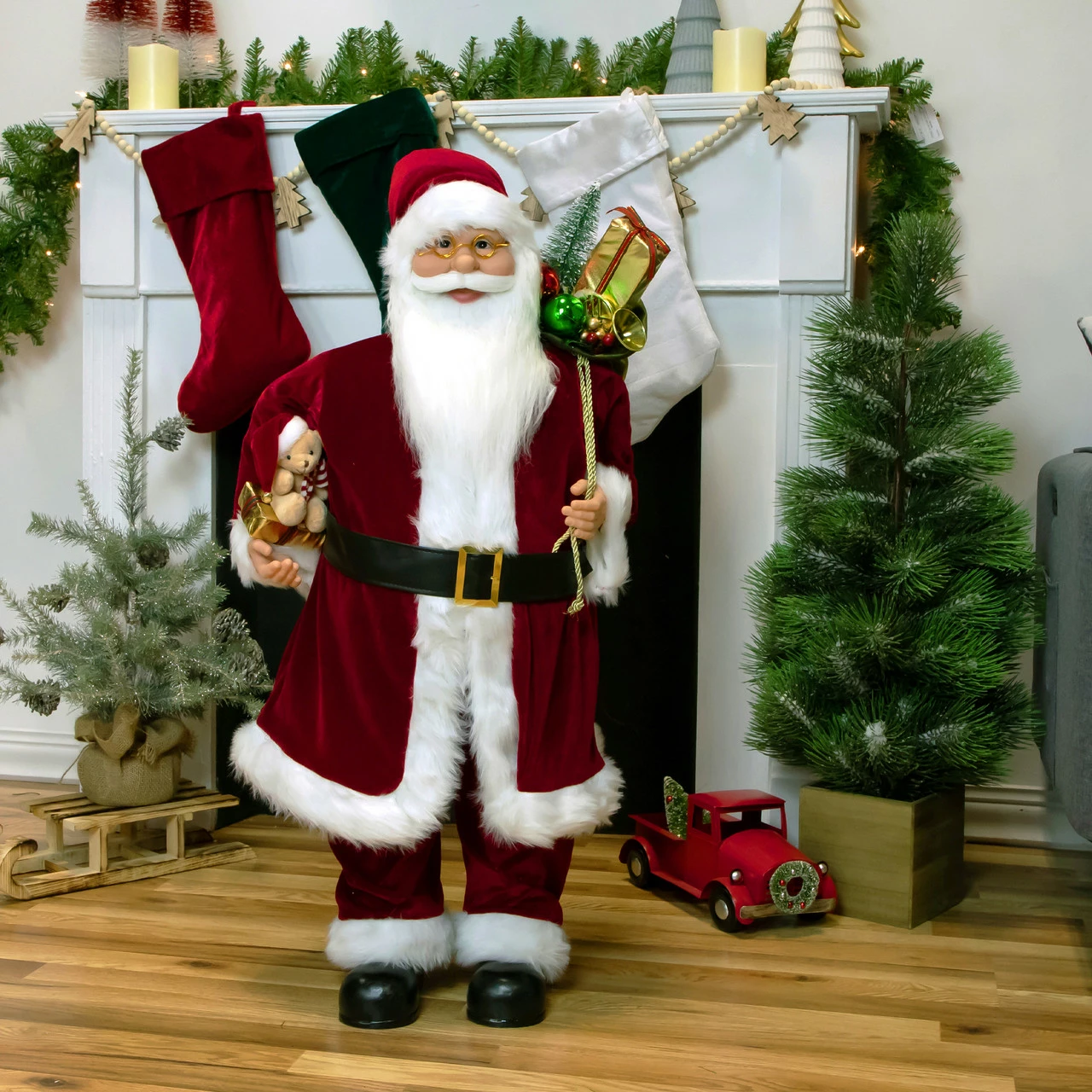 Features his traditional red and white suit with faux fur accents, black boots, and belt