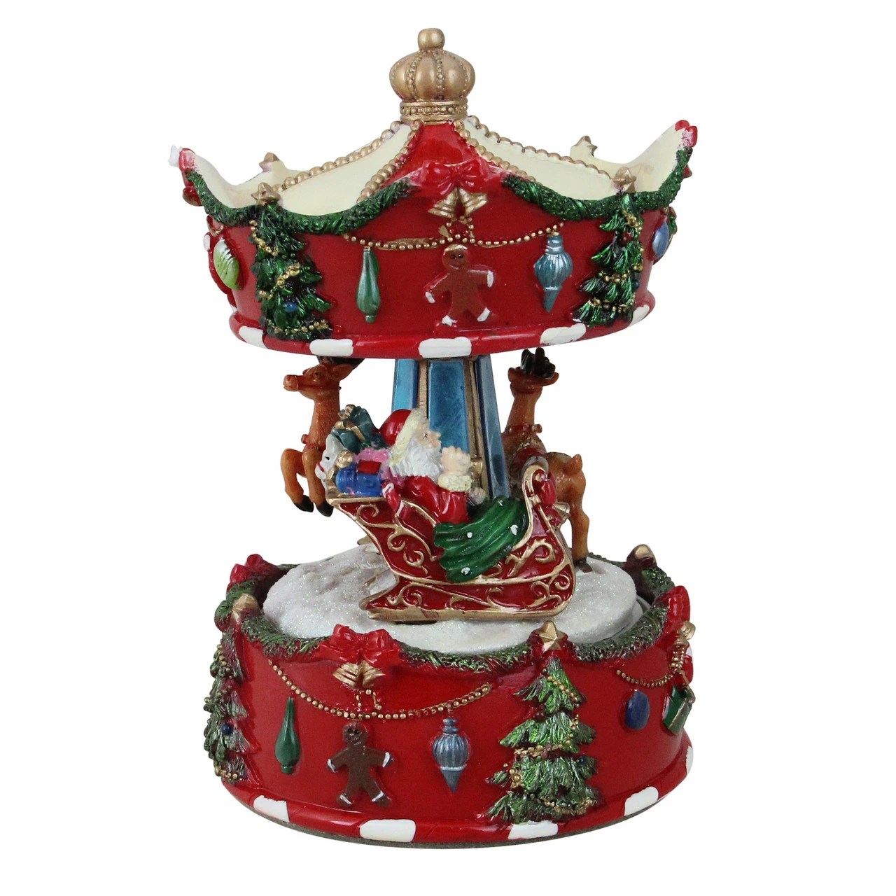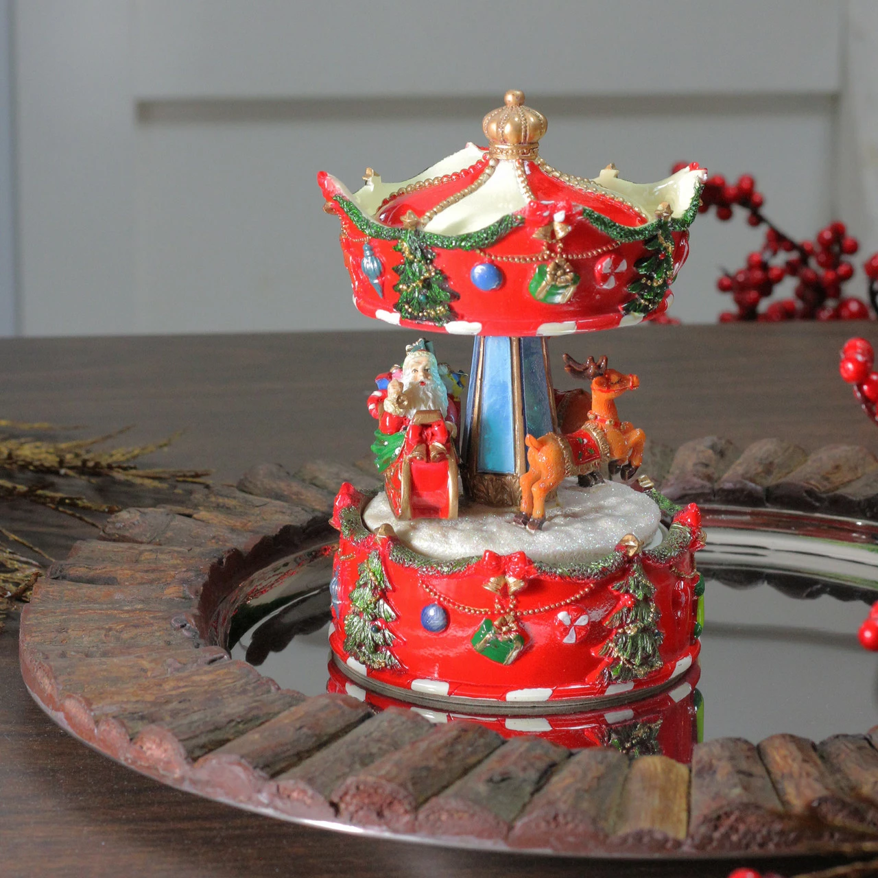 Wind it up to hear it play “We Wish you a Merry Christmas” while the carousel rotates