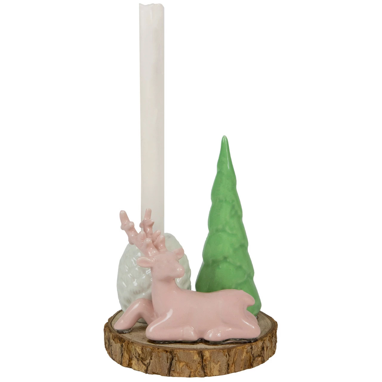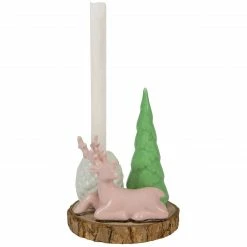 Pink reindeer with green tree and white pine cone