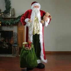 Santa is wearing a long red robe with faux fur, green velvet pants, and a gold vest