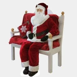 Dressed in a traditional red suit with white cuffs and gold wire glasses