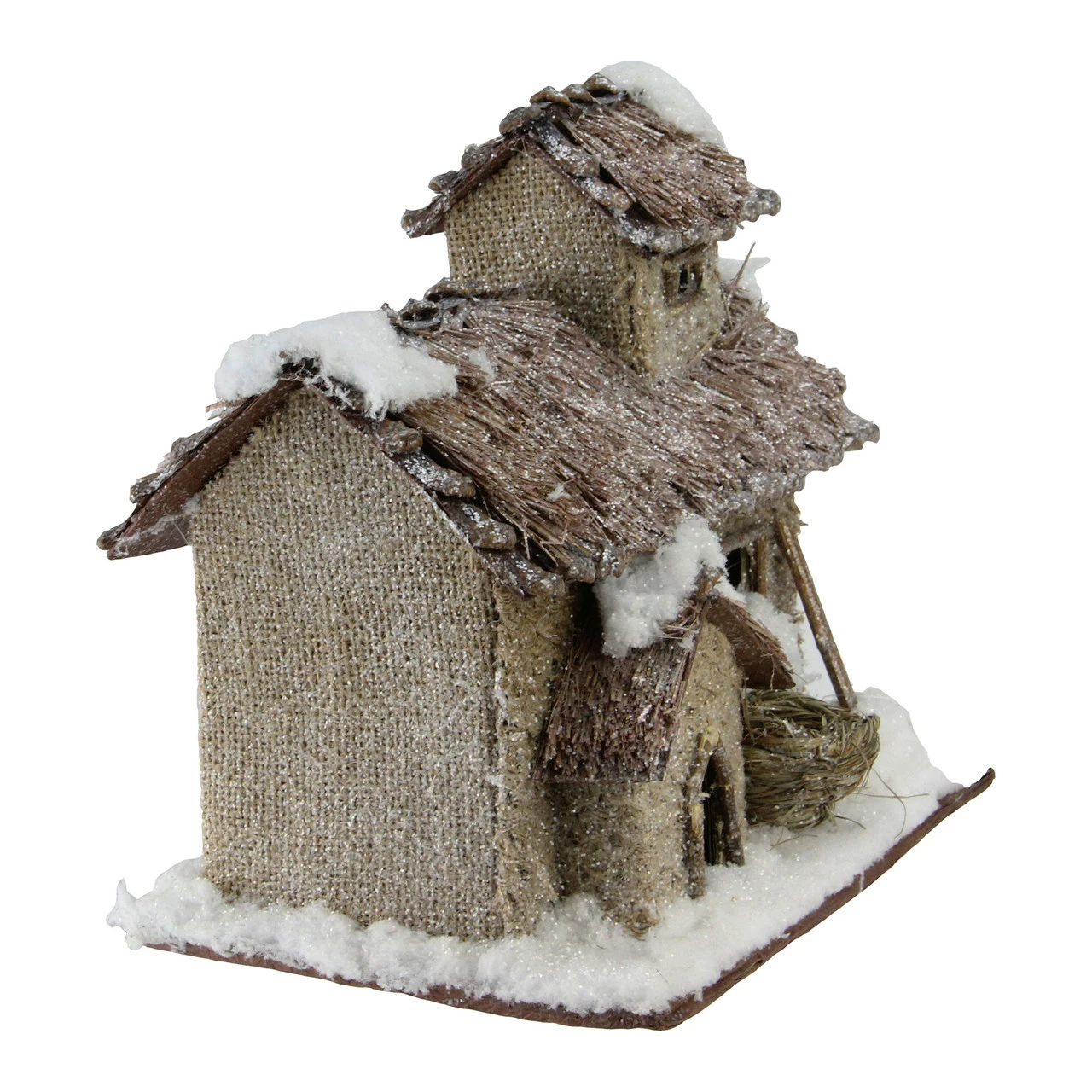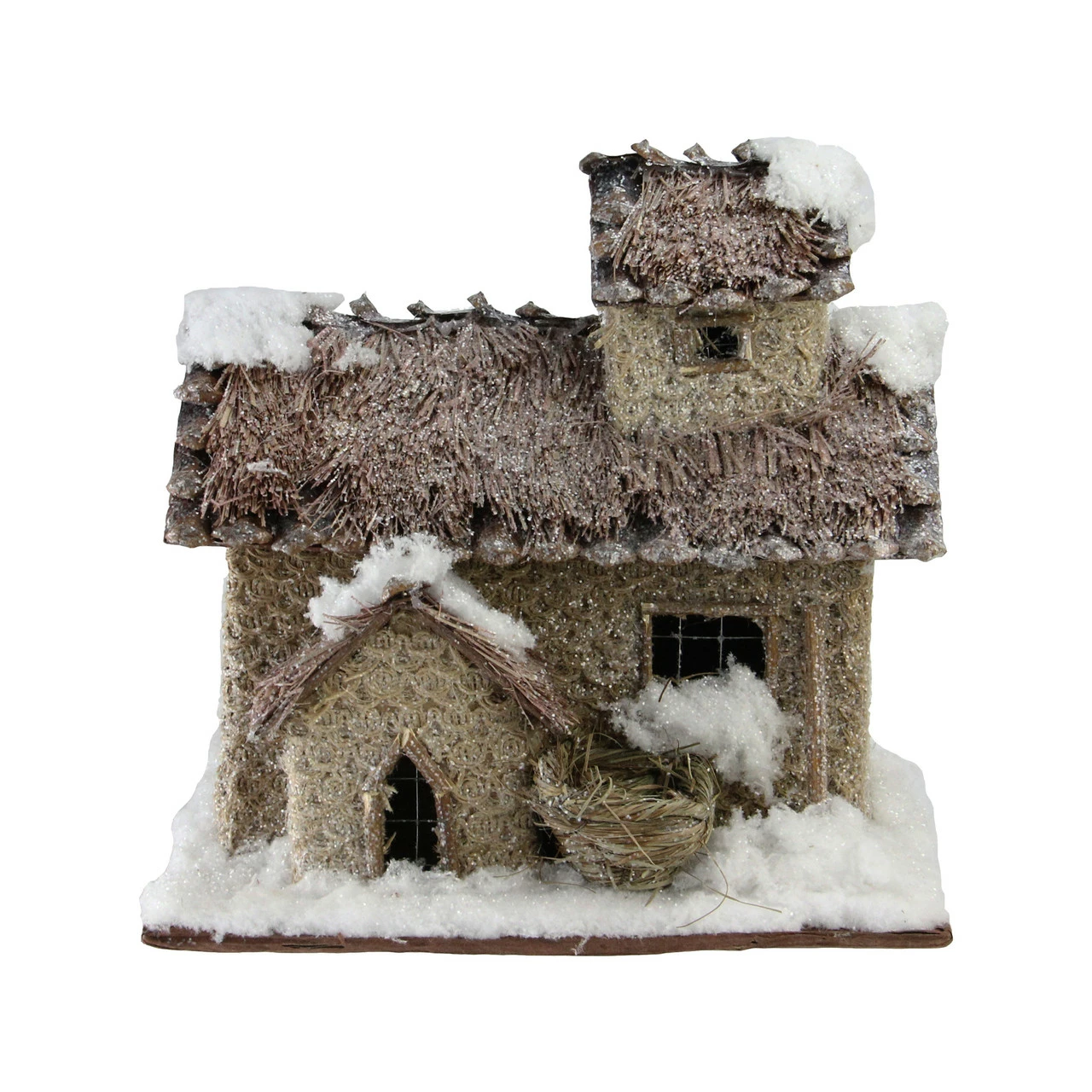 Featuring a 2 story cabin with a thatched roof and faux snow