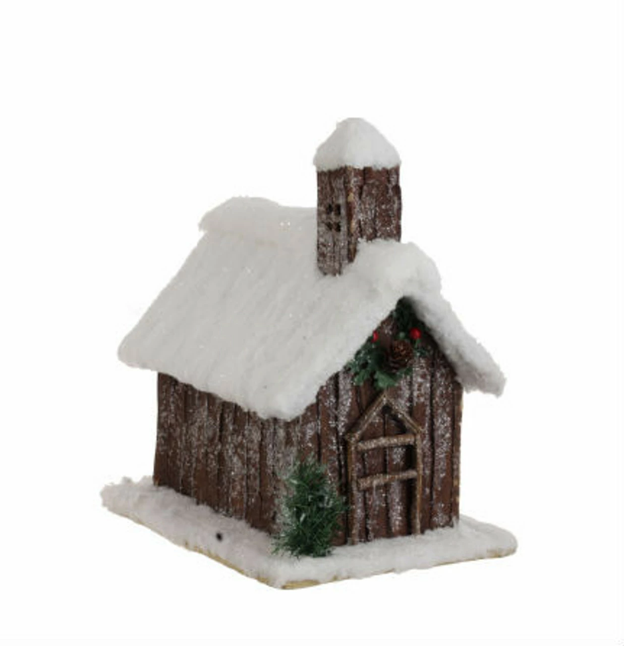 Features a depiction of a quaint country cabin decorated for Christmas morning flocked in synthetic snow and touched in clear glitter to reflect the glowing light of such an occasion