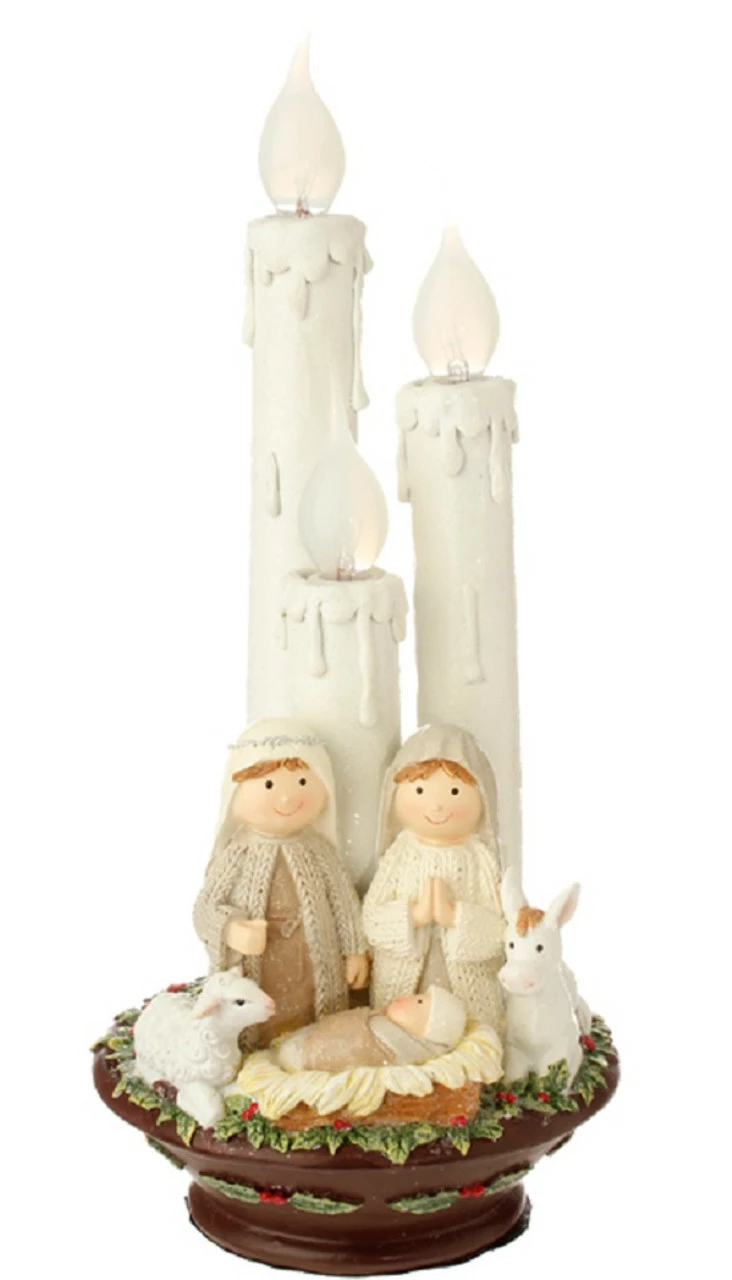 Features the Holy Family in faux-knit robes flanked by a sheep and a donkey on top of a bed of holy