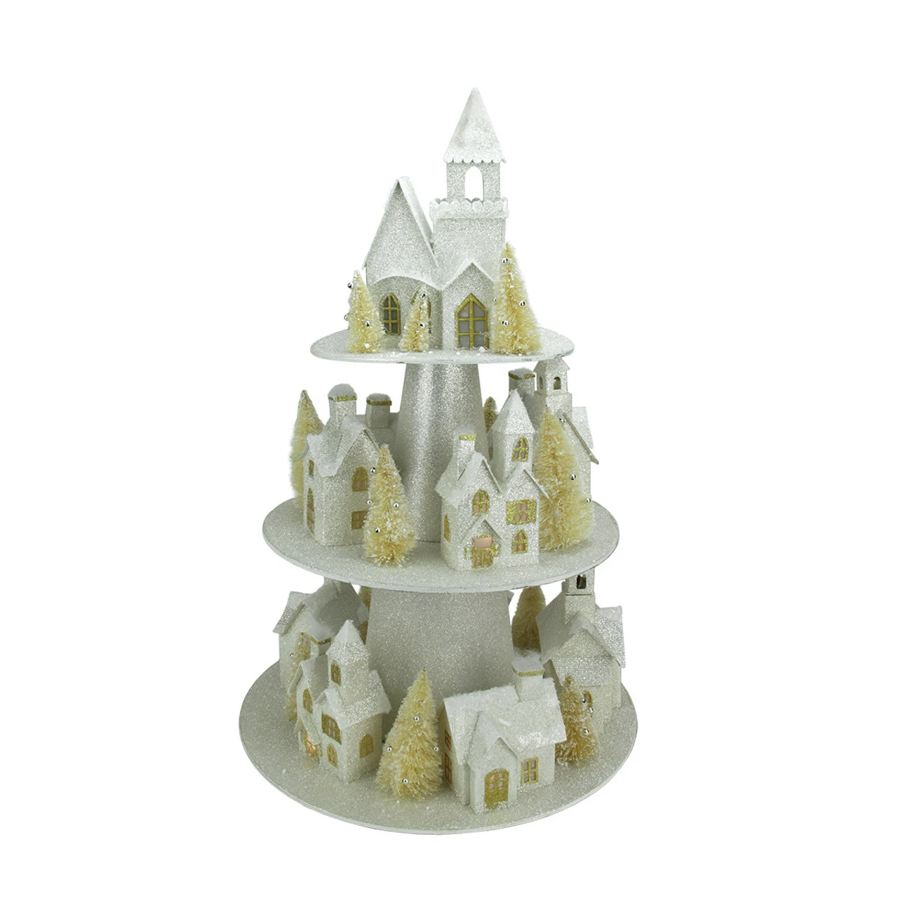 Creative display features 3 tiers of houses and churches decorated for the holidays