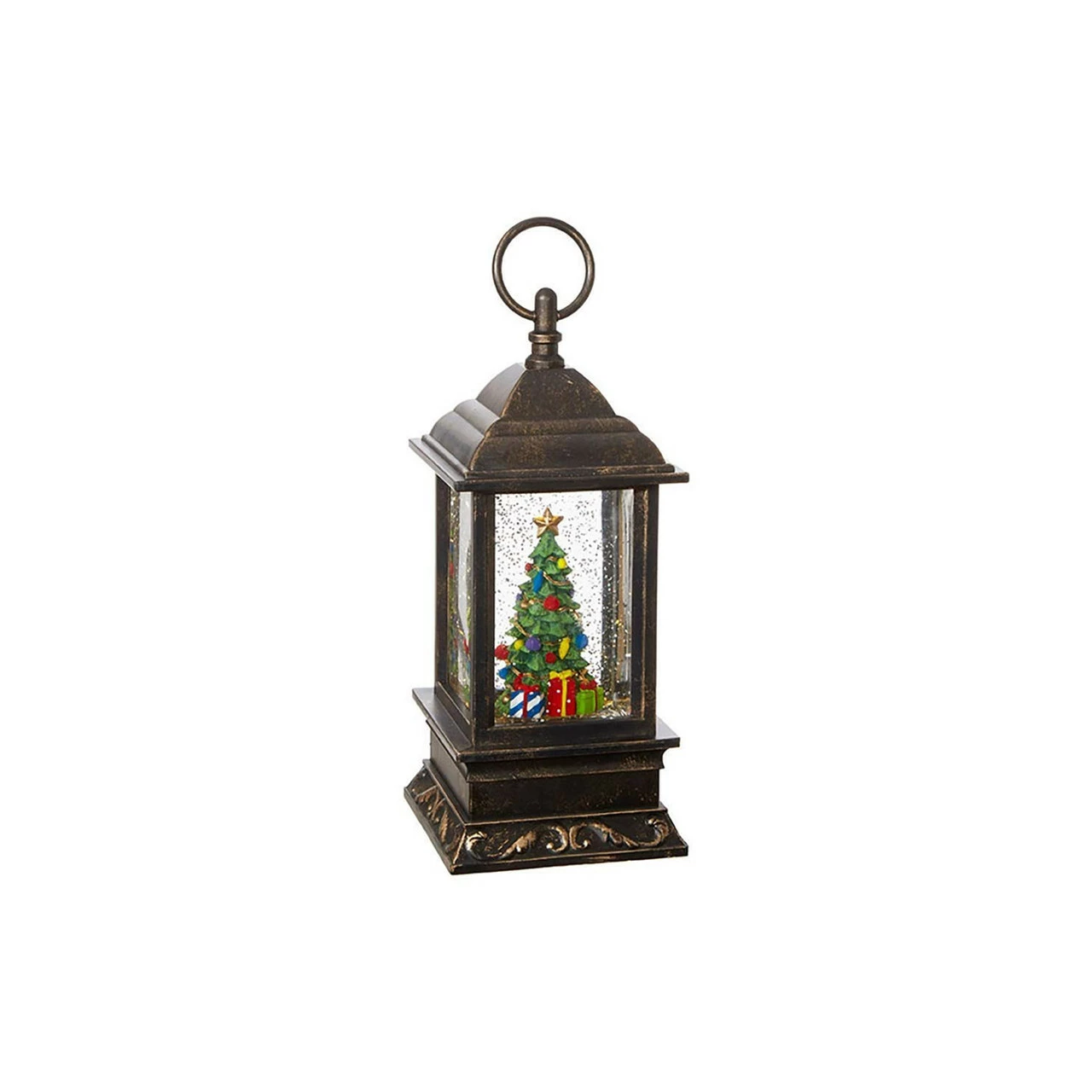 Features a decorated Chrismas tree with presents in a swirling glitter water lantern with or without music