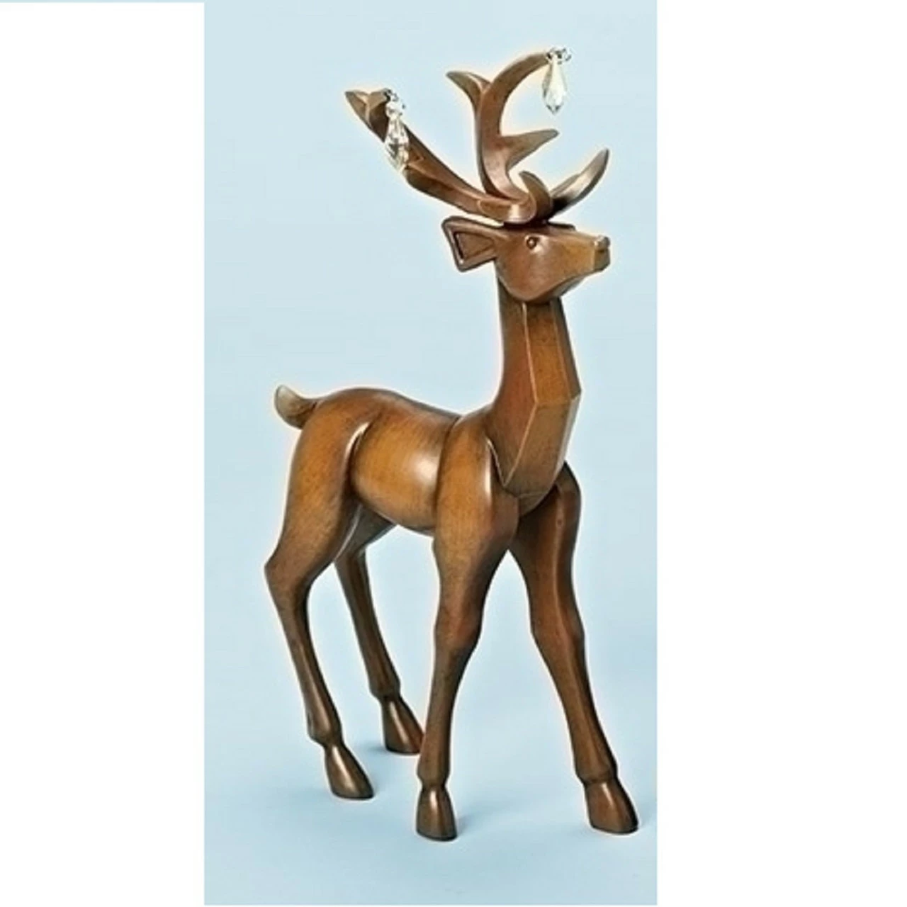 This decoration depicts a faux wood finish deer standing and is decorated with a faux jewels on each antler