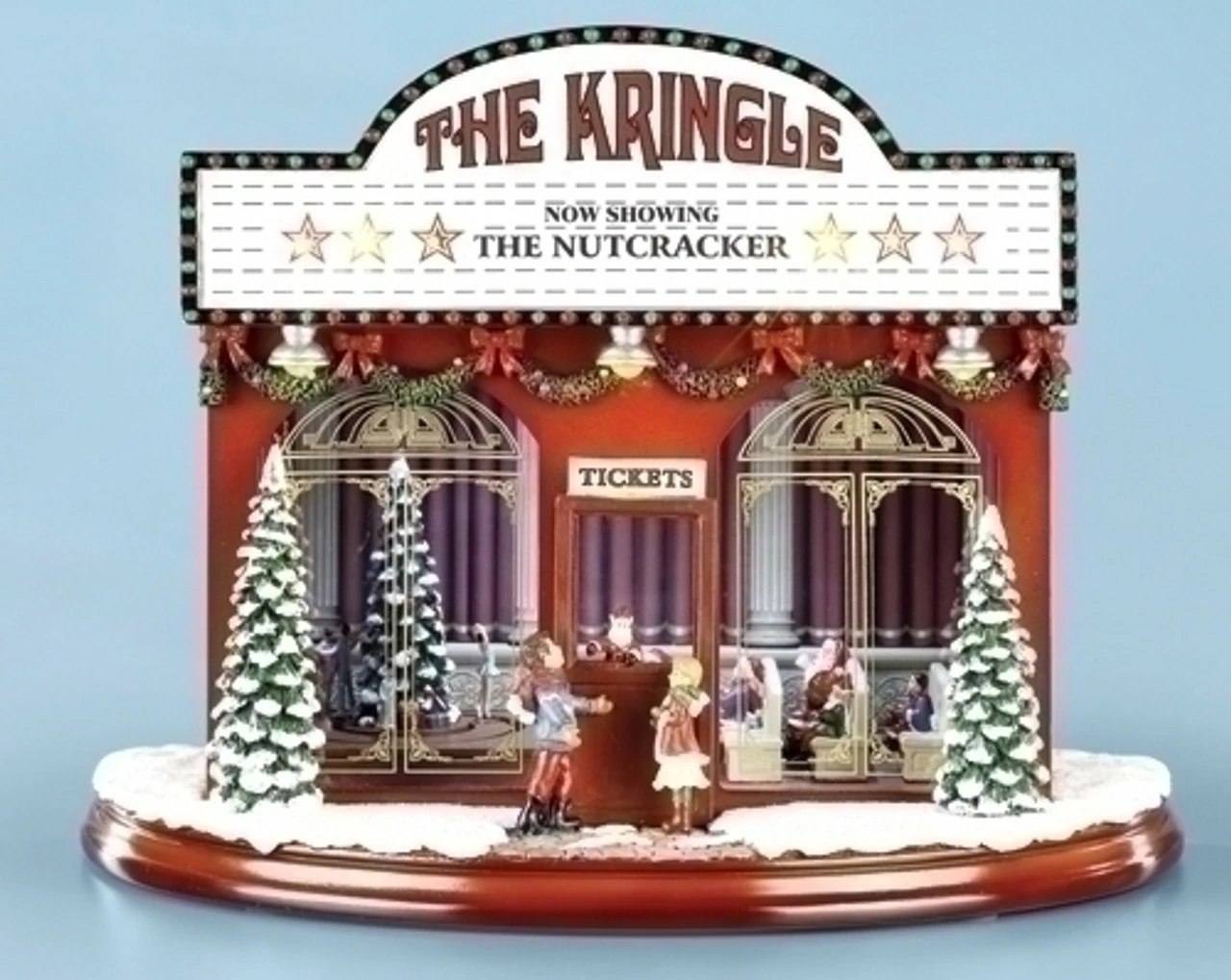 Features a winter scene at “The Kringle” theatre with children at the ticket counter and Santa already inside ready to enjoy the show