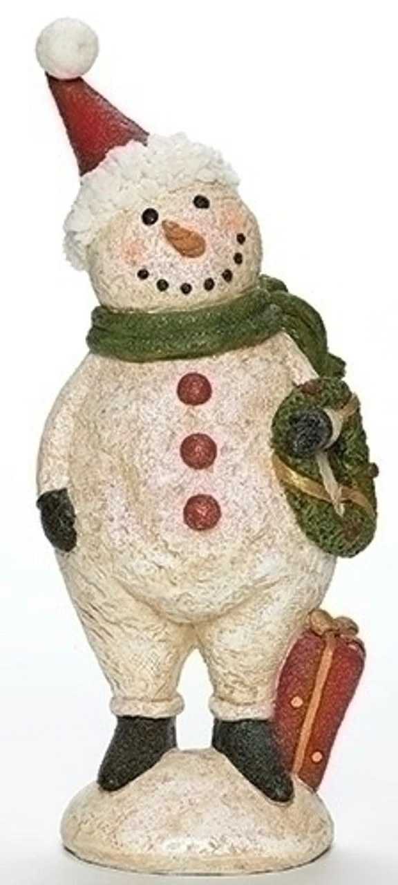 Snowman is holding a Christmas wreath and has a tall red Christmas present at his feet