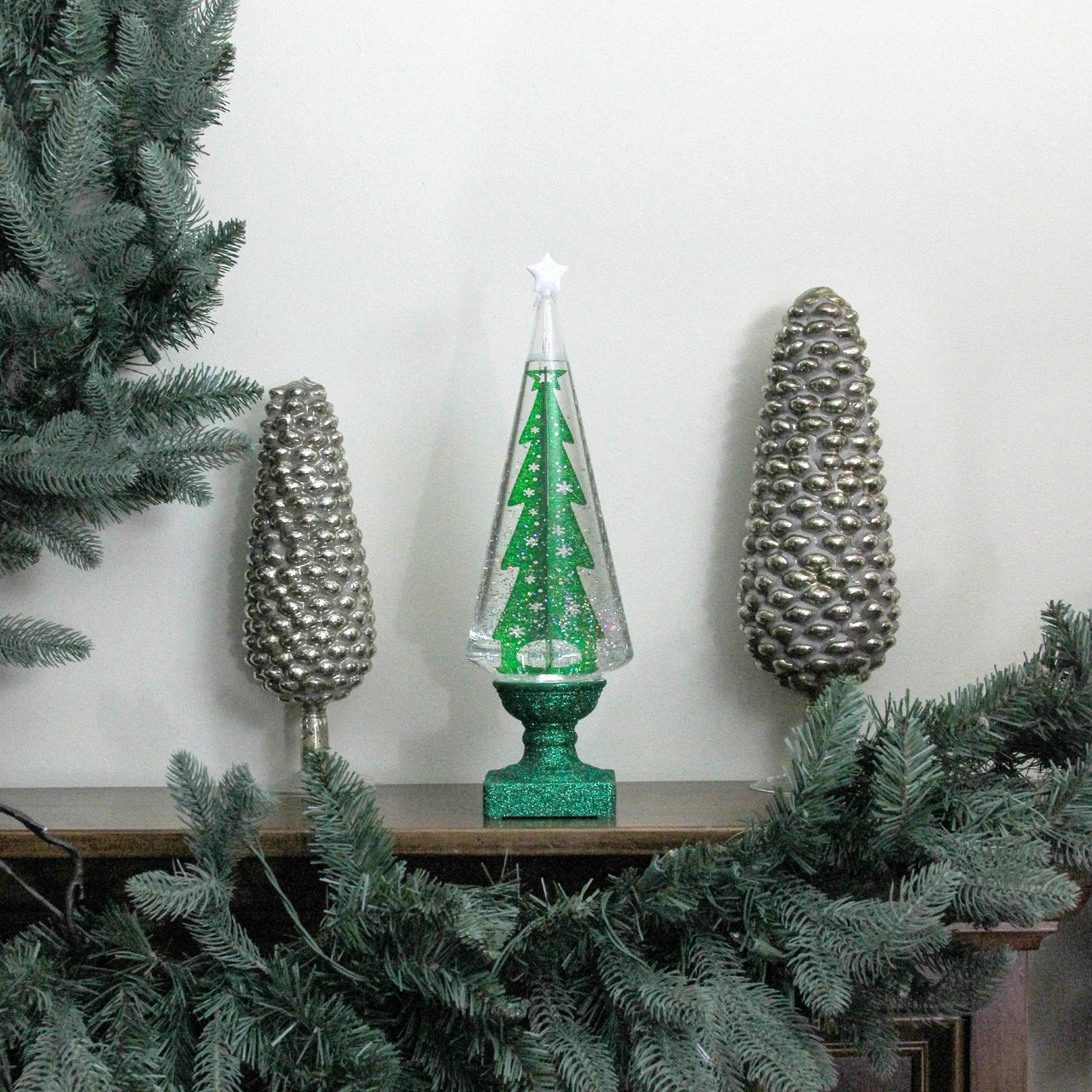 Water globe is a spherical shape with a green 3-dimensional Christmas tree inside with silver glitter and a white glitter star on top