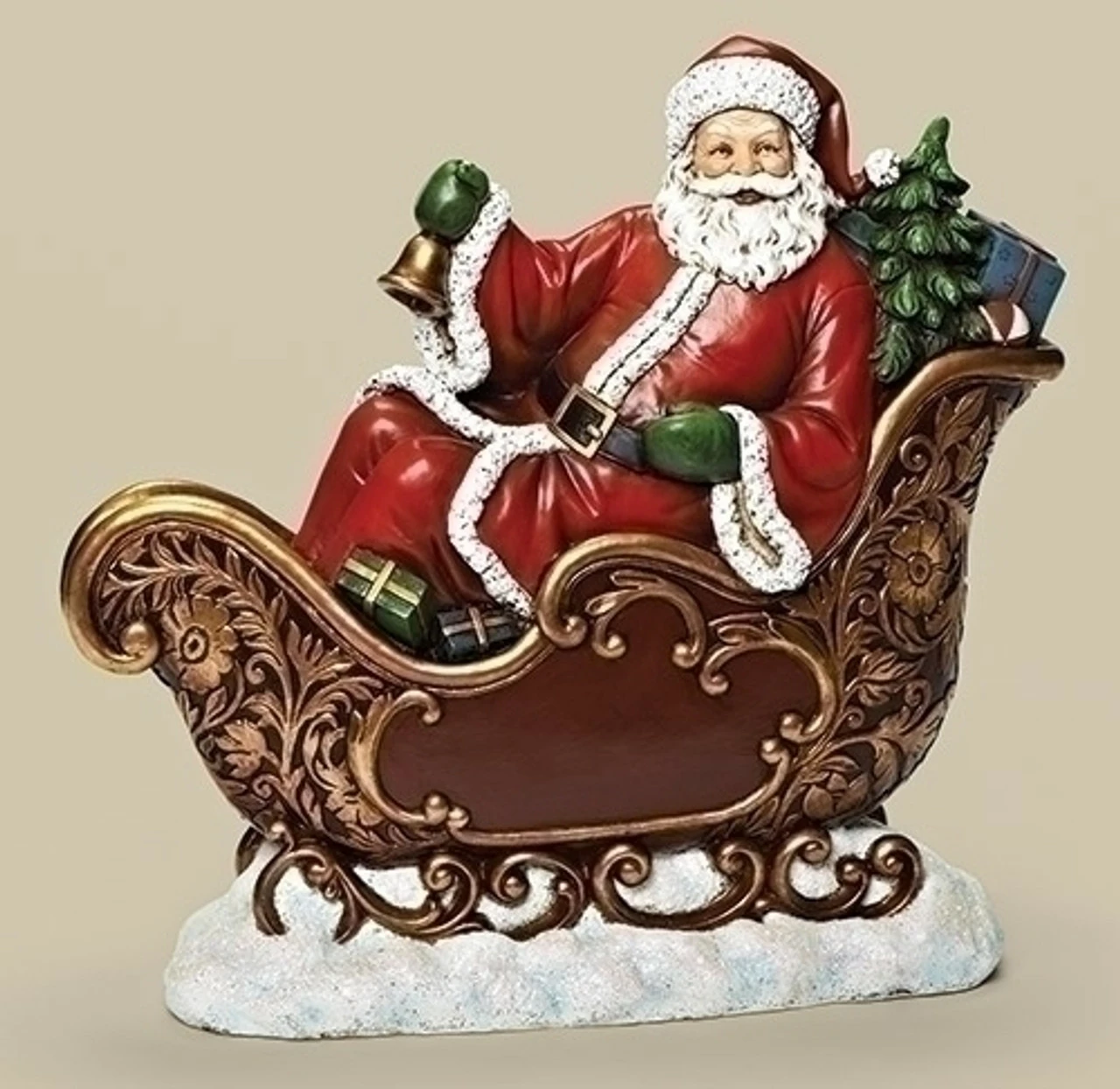 Santa holds a bell and is accompanied by several well-wrapped gifts and a Christmas tree
