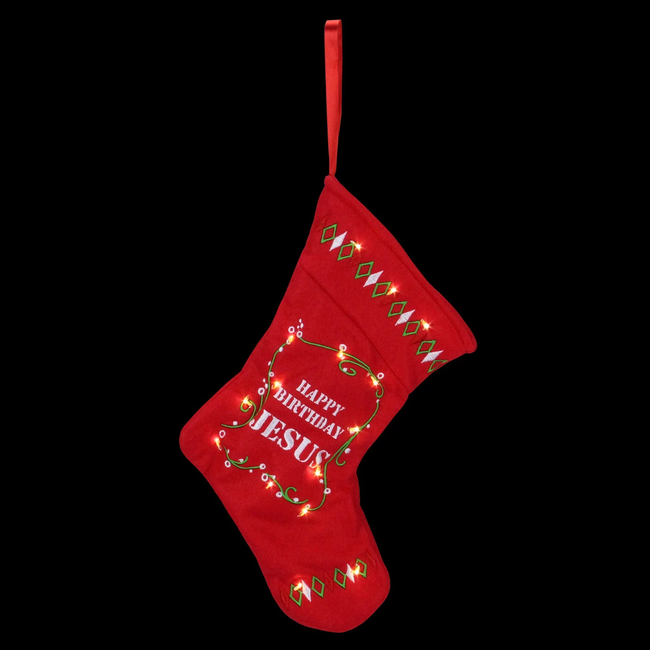 The stocking reads “Happy Birthday Jesus” with a swirl design