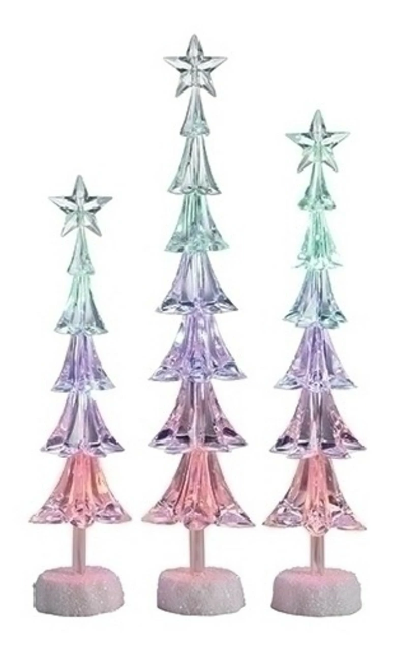 Trees have an icy look and lighted with multi-colored LED lights and accented with a single star